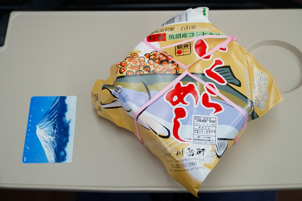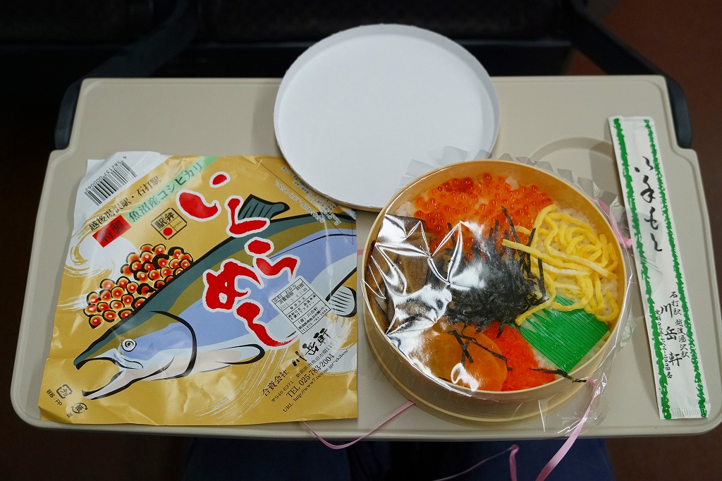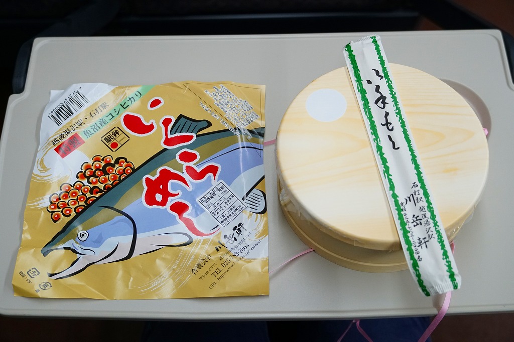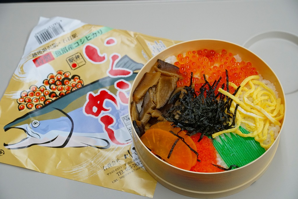 この名前では2021(令和3)年までに発売か。丸くて固い上げ底のプラ容器に、魚沼産コシヒカリの白飯を詰め、いくら醤油漬、たらこ、しいたけ煮、錦糸卵、刻み海苔、干し大根なる漬物で覆う。そんな中身と容器は、同じ調製元の越後湯沢駅弁「いくらたらこめし」と同じ。名前を変えて、スリーブを掛紙に替えて、越後湯沢駅で1,200円の駅弁がここでは1,490円。価格を上乗せする何らかの理由があるのだろうか。ガーラ湯沢駅でのみ売られる駅弁と思われるが、掛紙には「越後湯沢駅・石打駅」の表記がある。