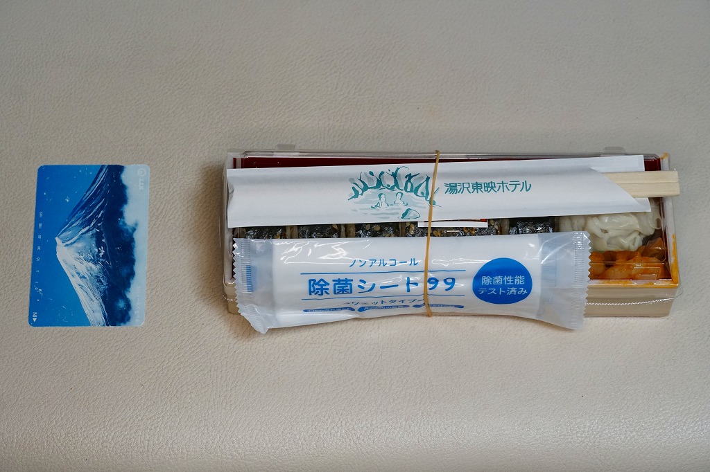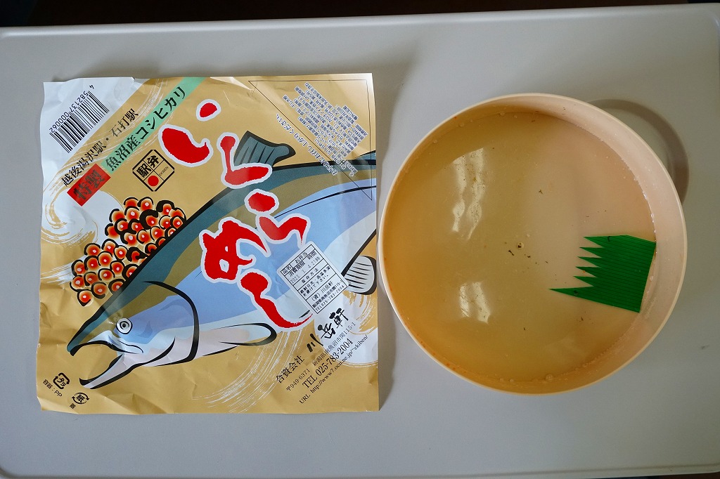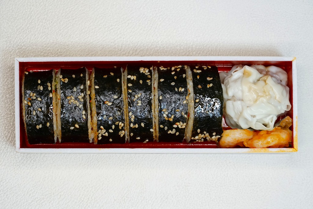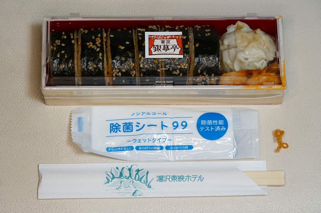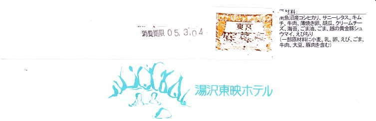 レシートでの商品名は「東映のり巻キンパ」。小さく細長い容器に韓国風海苔巻きを1本を、焼肉やキムチにきゅうりやクリームチーズなどを油飯と海苔で巻いたもの6切れを横たえ、焼売とエビチリを添える。常温で悪くない内容も、スーパーかデパートの惣菜なら半額で買えそうな観光地価格、そして新潟県湯沢で東京を名乗る韓国風という不思議。調製元は大手映画会社が運営する越後湯沢市街のホテルかどうか。