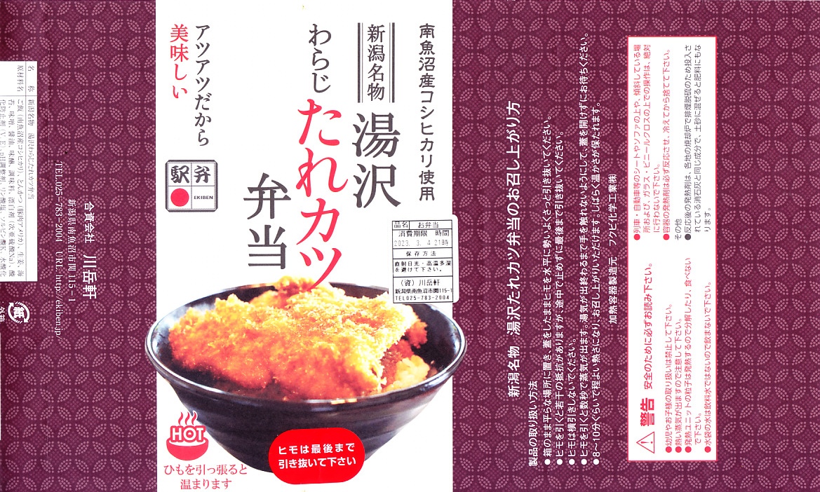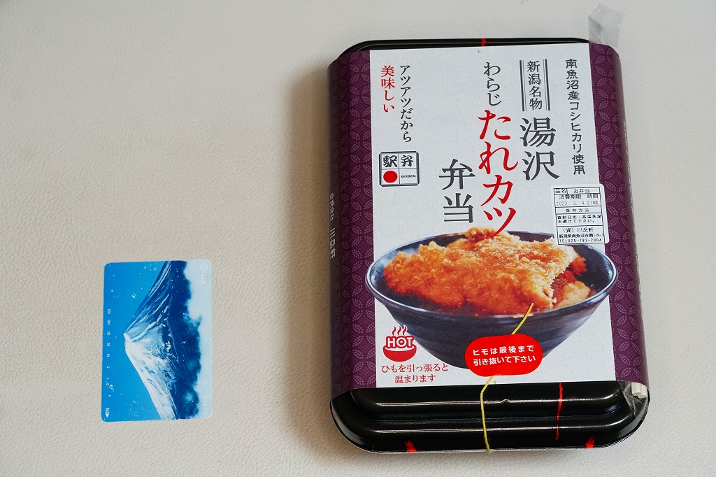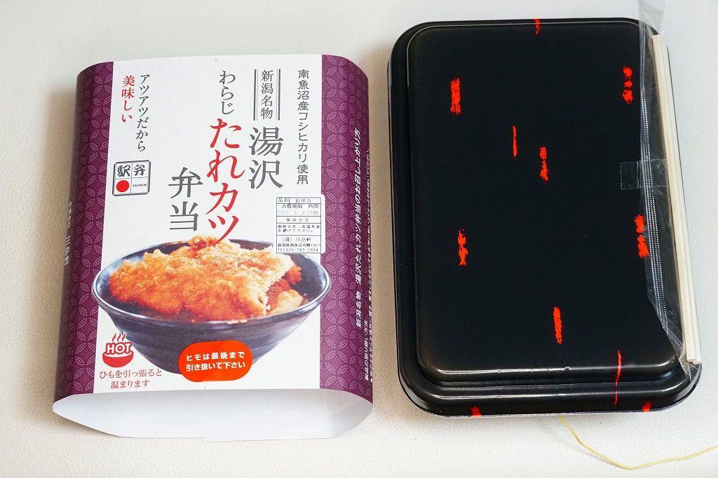 2015(平成27)年までには発売か。長方形の加熱機能付き容器に、南魚沼産コシヒカリの白飯を詰め、刻み海苔を軽く振り、新潟名物湯沢わらじたれカツを名乗るトンカツのソース漬けを載せ、紅生姜を添える。新潟県でも湯沢でなく新潟市内で親しまれる「タレかつ丼」の駅弁だろうか。味と質はそれよりも例えば千葉駅弁「トンかつ弁当」のような印象で、加熱機能付き容器の値段を加えてもこれが1,450円もするのは、観光地価格にしても高いなあと感じた。