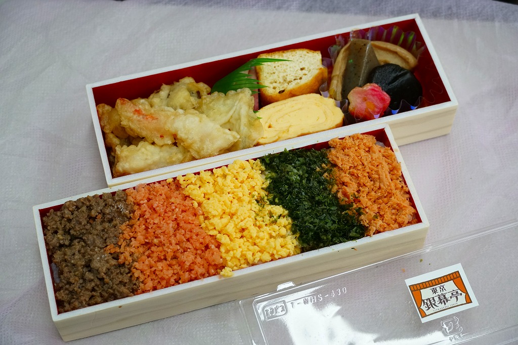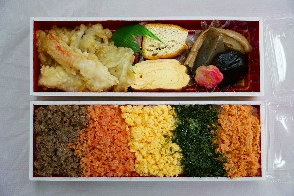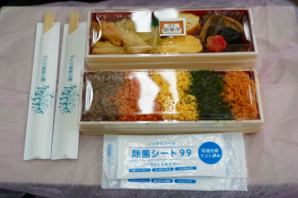 レシートでの商品名は「洋食2食弁当」。小さく細長い容器を2段に重ねて、風呂敷で包む。中身は下段が白飯を刻み海苔、炒り卵、鮭そぼろ、肉そぼろで覆うもの、上段が煮物、玉子焼、天ぷらなど。おしぼりと割りばしが、ふたつずつ付いてきた。1,500円の駅弁あるいは惣菜という価値を見いだせるか。調製元は大手映画会社が運営する越後湯沢市街のホテルかどうか。