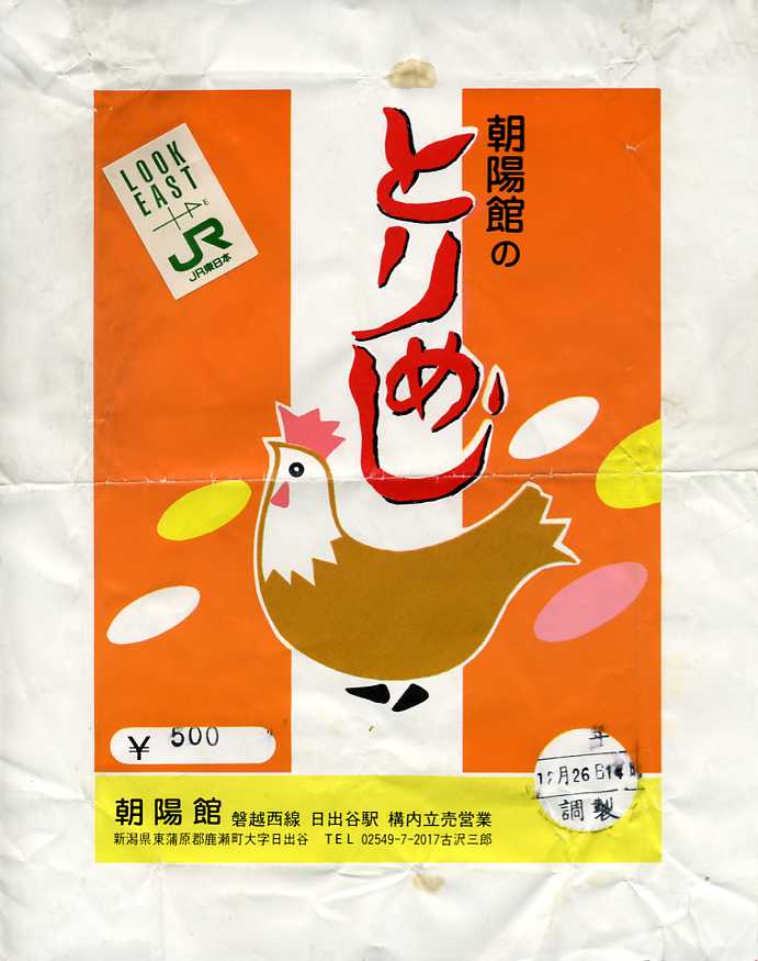 1990年前後の、12月26日14時の調製と思われる、昔の日出谷駅弁の掛紙。絵柄は上記の復活時と同じで、JR東日本の観光キャンペーン「LOOK EAST」のロゴマークを貼る。おそらく駅でいったん売り止める前のものだろう。「磐越西線 日出谷駅 構内立売営業」とは書いてあるが、駅弁の掛紙らしい注意書きはなくなった。