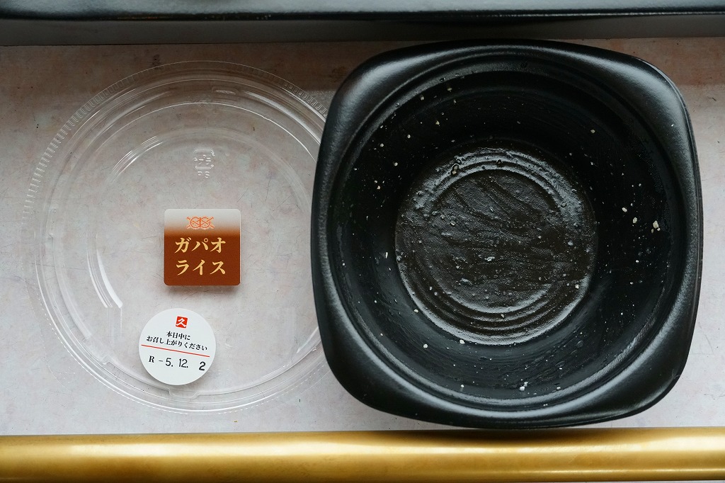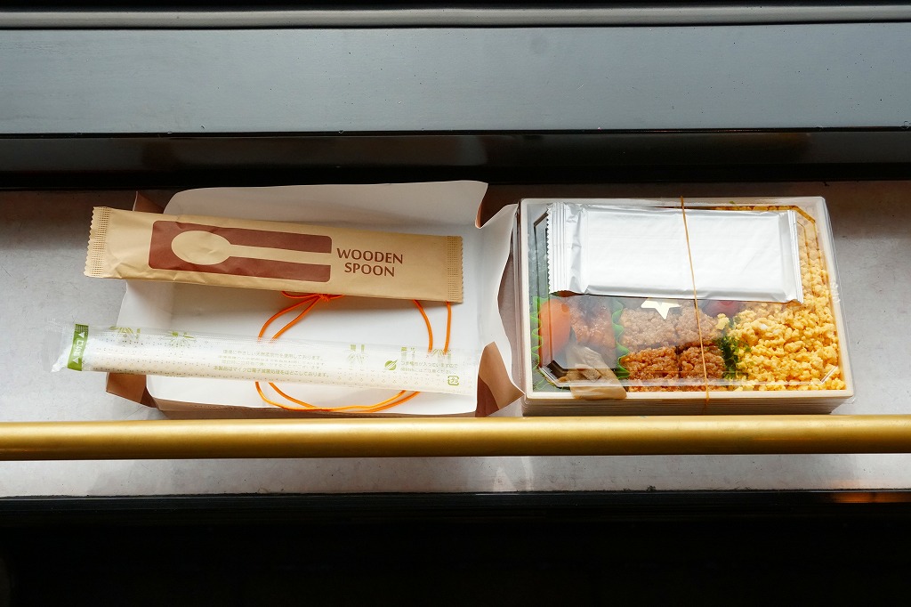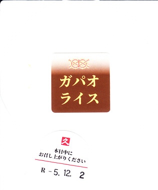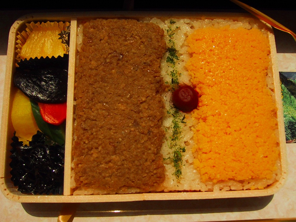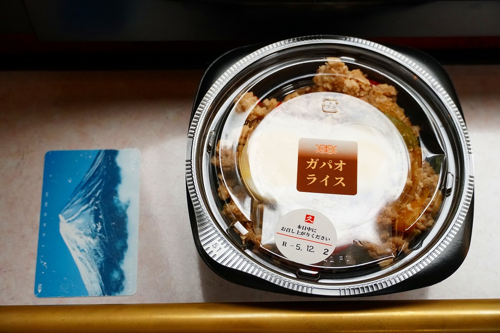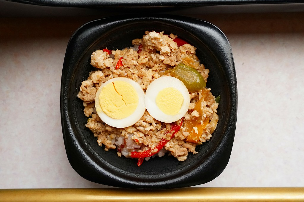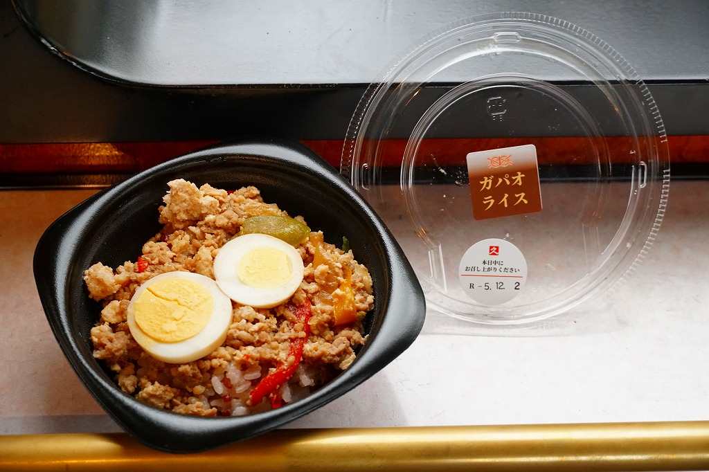 磐越西線の観光列車「SLばんえつ物語」会津若松駅行き列車の停車時間に、津川駅のホーム上で買えたお弁当。スーパーやコンビニの惣菜向けプラ容器に御飯を詰め、挽肉と野菜の炒め物を盛り、ゆで卵で彩る。SL列車やローカル線、新潟県や津川駅との関連は何もないと思うタイ料理。酸味や辛味はあまり感じられず、無難にいただけた。この年の秋の、SL列車の他の運転日には、栗飯や舞茸飯が売られたらしい。津川駅での17分の停車時間で殺伐と奪い合われた「とりめし」とは違い、これやポリ容器のお茶にプリンなどはのんびり買えた。新津駅行き列車の15分間の停車時間に、物販は出なかった。