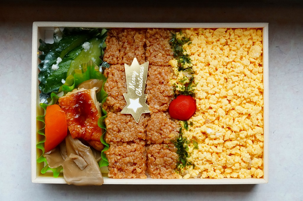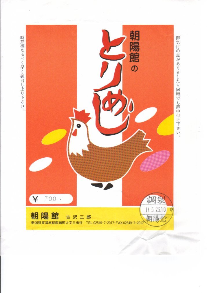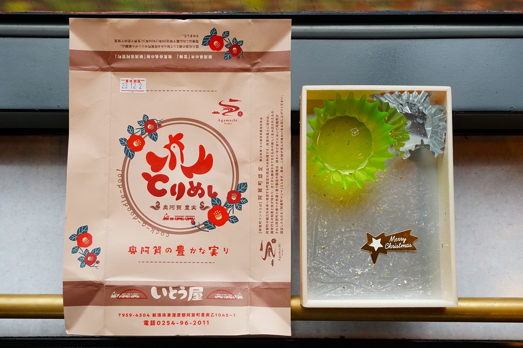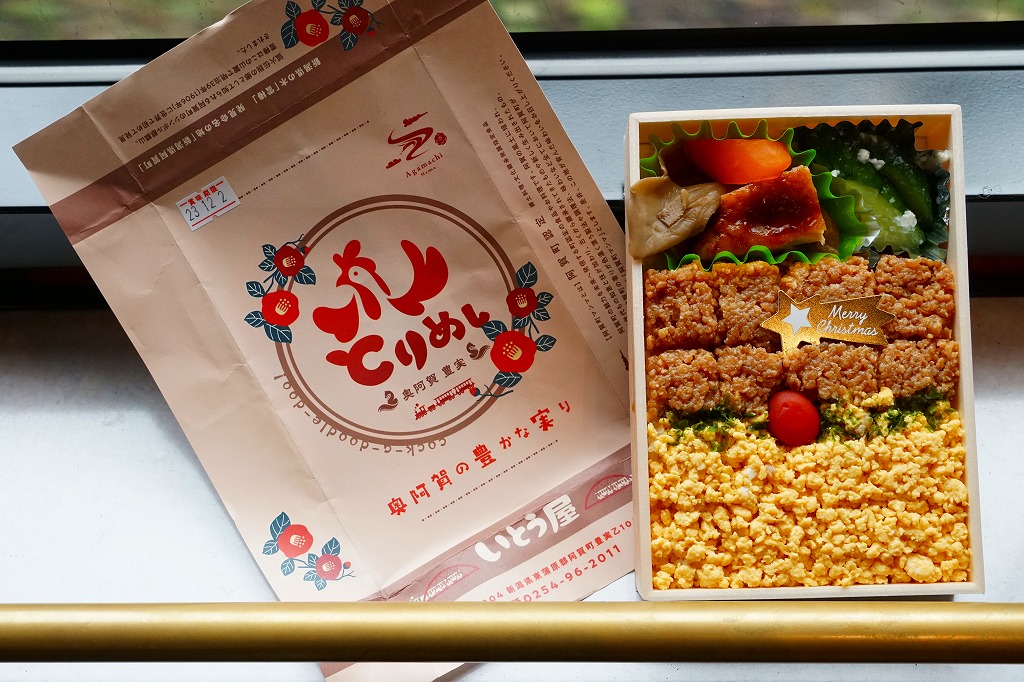 四角く浅い容器に白飯を詰め、鶏そぼろと玉子そぼろで覆い、梅干しと青のりを置き、鶏照焼、まいたけ、にんじん、青菜などを添える。かつての日出谷駅弁「とりめし」とは、飯の具の材料が同じことを除き、風味も食感も付合せも、容器も掛紙の絵柄も、何もかもが異なる新作。調製元はともかく販売駅も異なり、歴史の断絶を目の当たりにする。とはいえこの発売は東京のテレビ局のニュースにもなるほど注目され、津川駅ではかつての日出谷駅での販売のように客に殺伐と奪い合われる大人気。販売側でも人気を警戒してか、1人1個限定で、SL列車の乗客に販売した後に余っていたら他の客に売る態勢を敷いた。今回の乗車日はクリスマス扱いで、そんな紙片が弁当に入っていた。