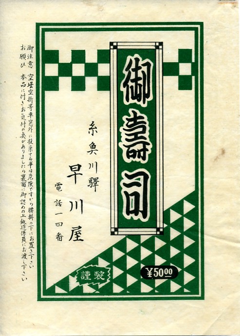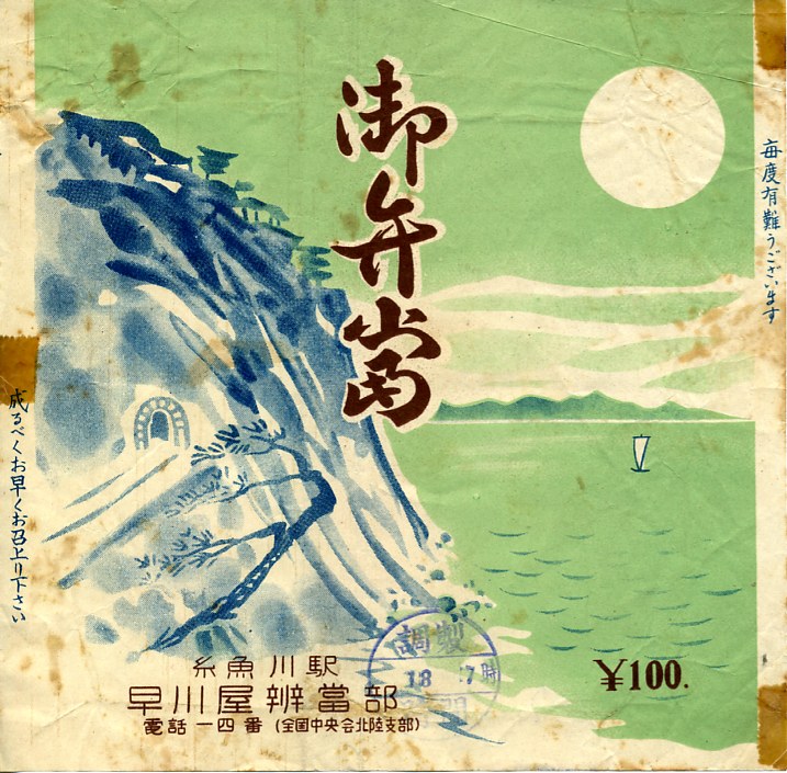 おそらく1950年代のものと思われる、昔の糸魚川駅弁の掛紙。価格から判断して紛れもない第二次大戦後の掛紙であるが、漢字は主に旧字体が使われている。