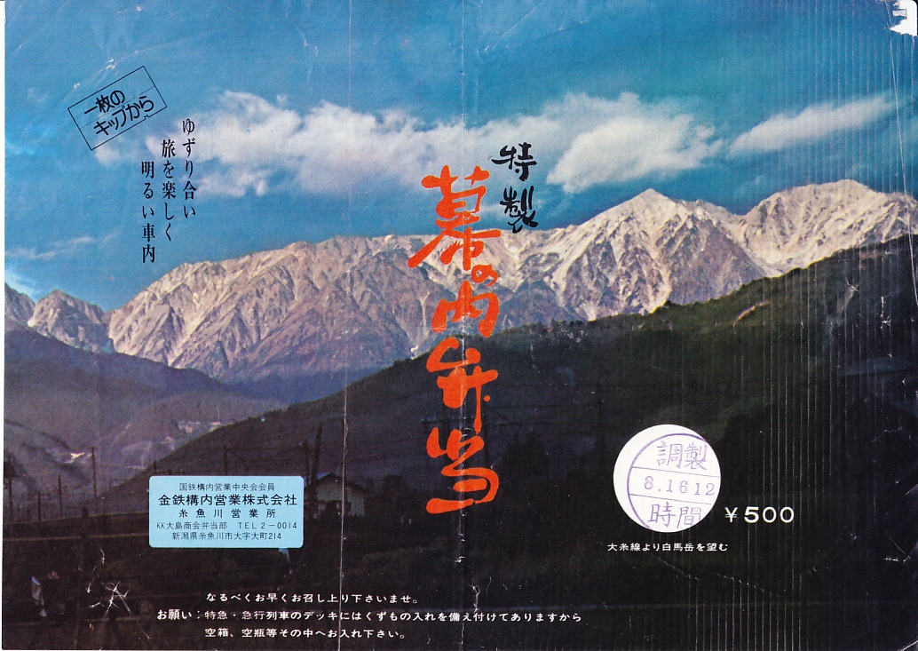 1977(昭和52)年頃のものと思われる、昔の糸魚川駅弁の掛紙。「大糸線より白馬岳を望む」という風景写真が使われる、昭和後期の駅弁掛紙らしい姿。調製元の大島商会弁当部は、従前の早川屋で、以後のたかせと同じものか。