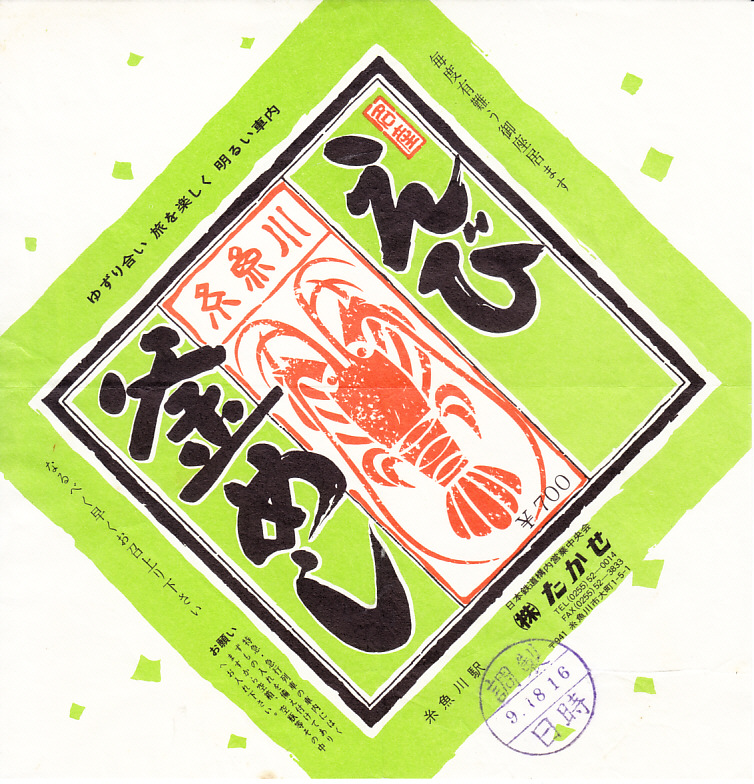 1987(昭和62)年か翌年の、9月18日16日の調製と思われる、昔の糸魚川駅弁の掛紙。日本鉄道構内営業中央会とあるので1987(昭和62)年4月の国鉄分割民営化の後で、1989(平成元)年4月の消費税の導入により価格が720円なる前のものか。上記の駅弁「えび釜めし」と、中身は変わらなかった模様。掛紙の絵柄は異なり、しかしその雰囲気はあまり変わらず、おそらく当時は焼き物の釜に木のふたをしたと思われる。
