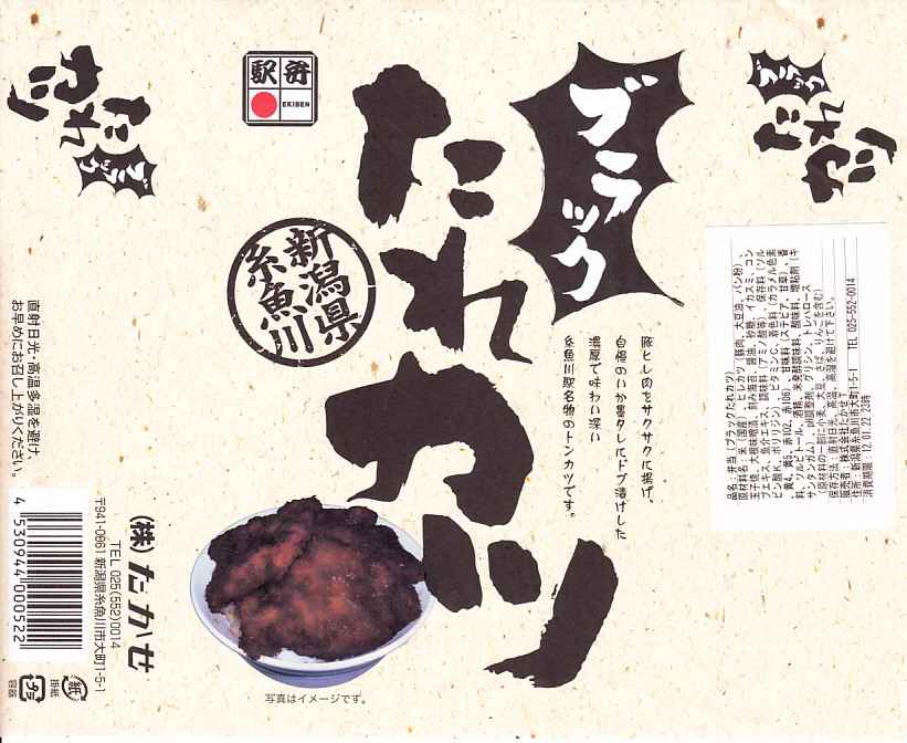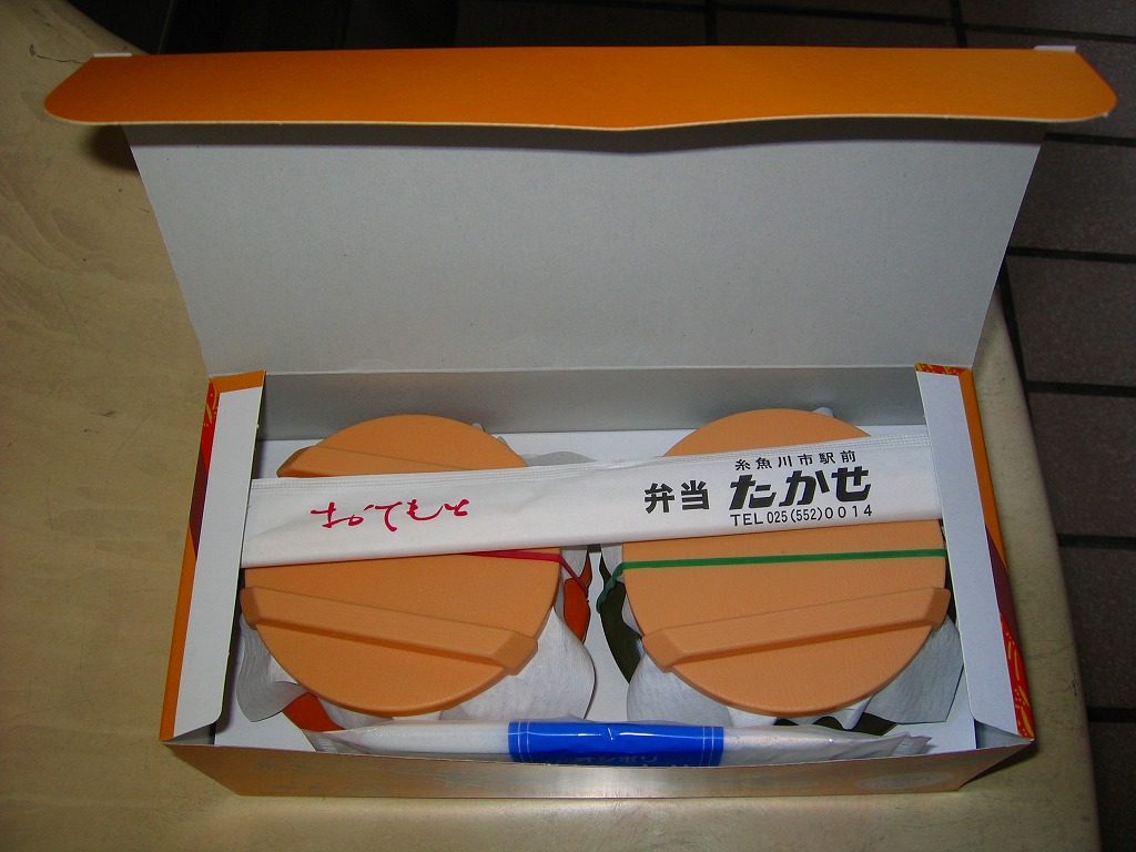 「駅弁図鑑 西日本版」によると2012(平成24)年2月23日の発売。ということは、京王百貨店の駅弁大会での輸送販売は先行販売か。いずれにせよ、糸魚川駅では今世紀あるいは平成に入って初めての新作駅弁ではないかと思う。真っ黒な長方形の容器に透明なふたをして、商品名の黒書きや中身のイメージ写真などを印刷した掛紙を巻く。