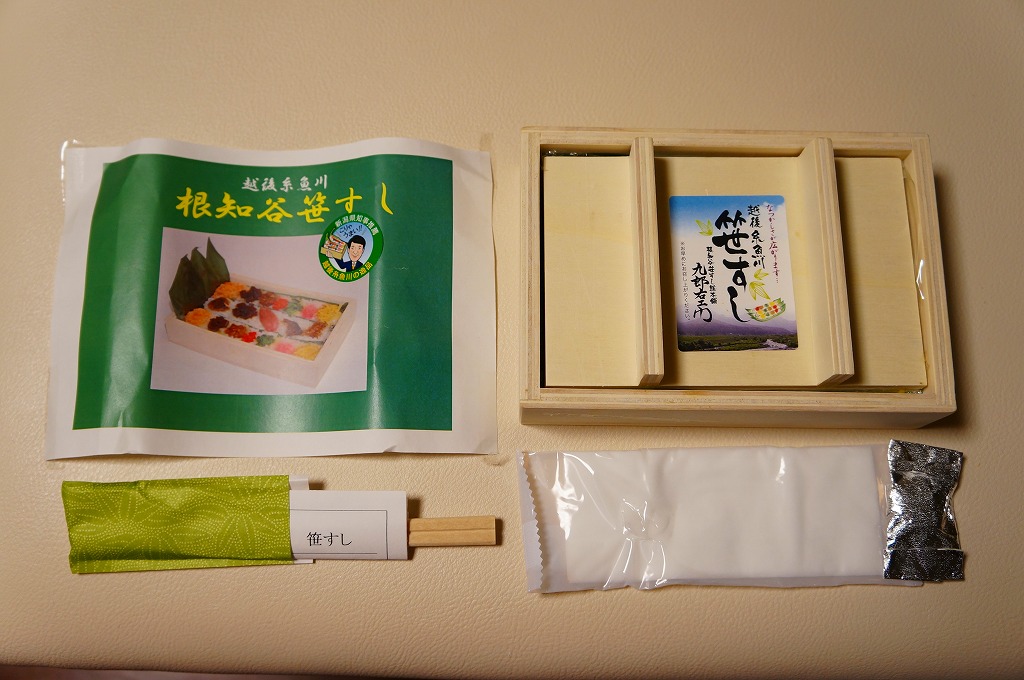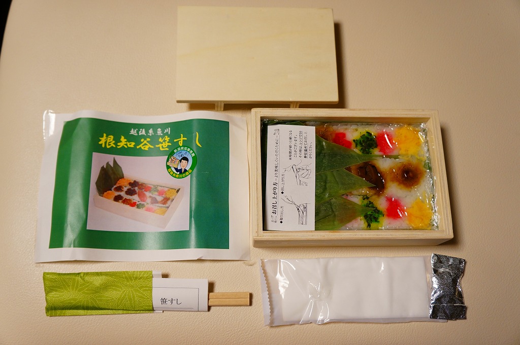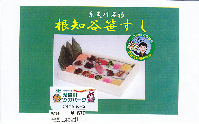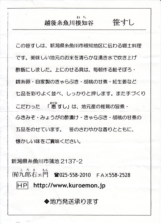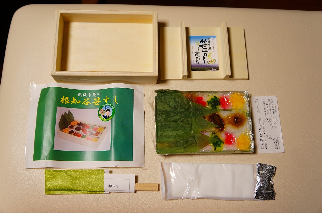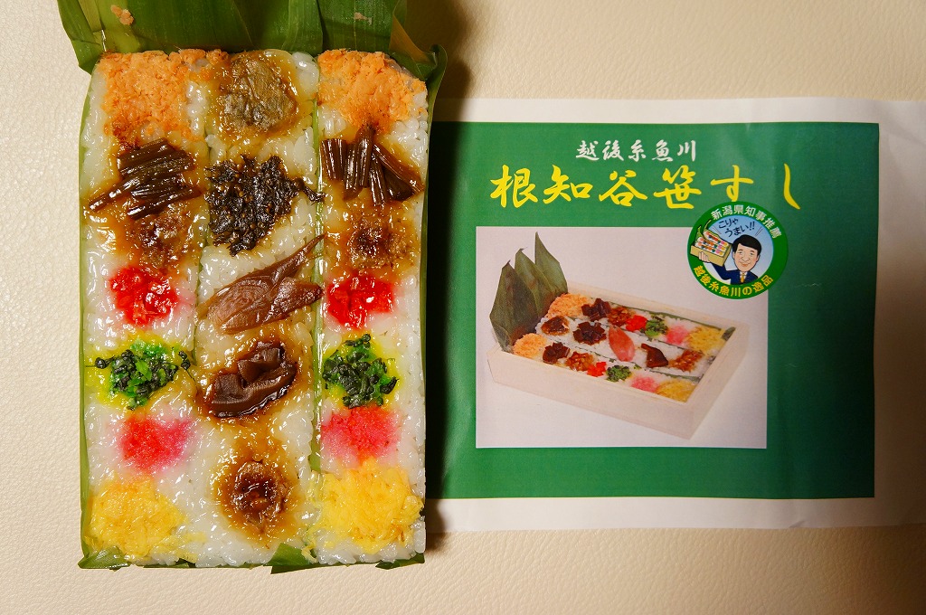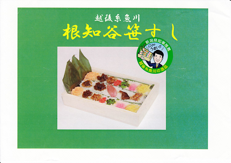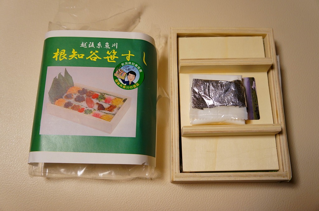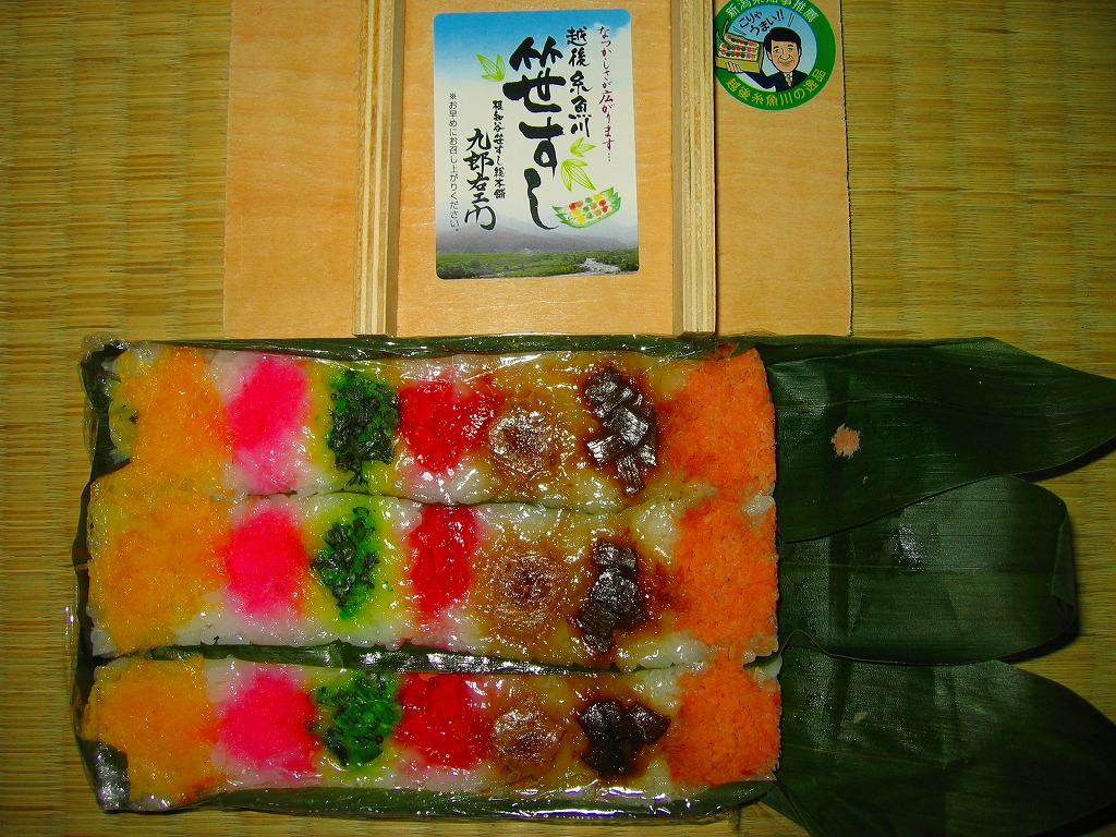 2009(平成21)年の購入時の数年前から、越後湯沢駅や糸魚川駅の売店で販売されていた、糸魚川の郷土料理。とても小さな木製の押寿司容器をラップで包む。容器の中でさらにラップで包まれた中身は、笹の葉に酢飯を詰めて、卵、桜でんぶ、青シソの実の漬物、紅生姜、くるみ、キャラブキ、鮭そぼろをこの順番で貼り付けた、やはりとても小さな棒状笹寿司が3本入るもの。商品の解説と宣伝として、手書きのコピーがついていた。