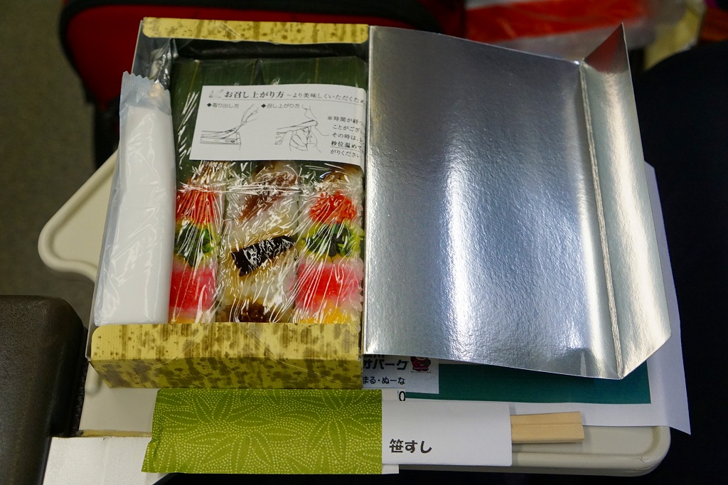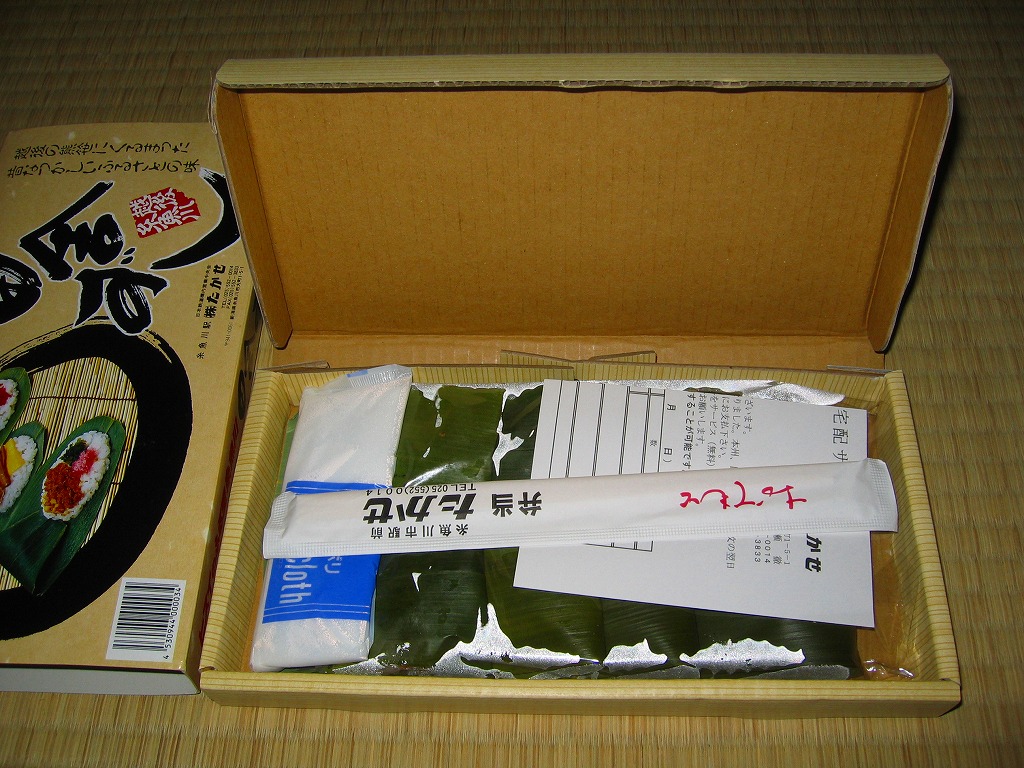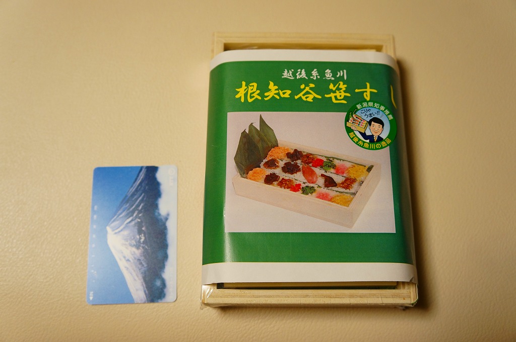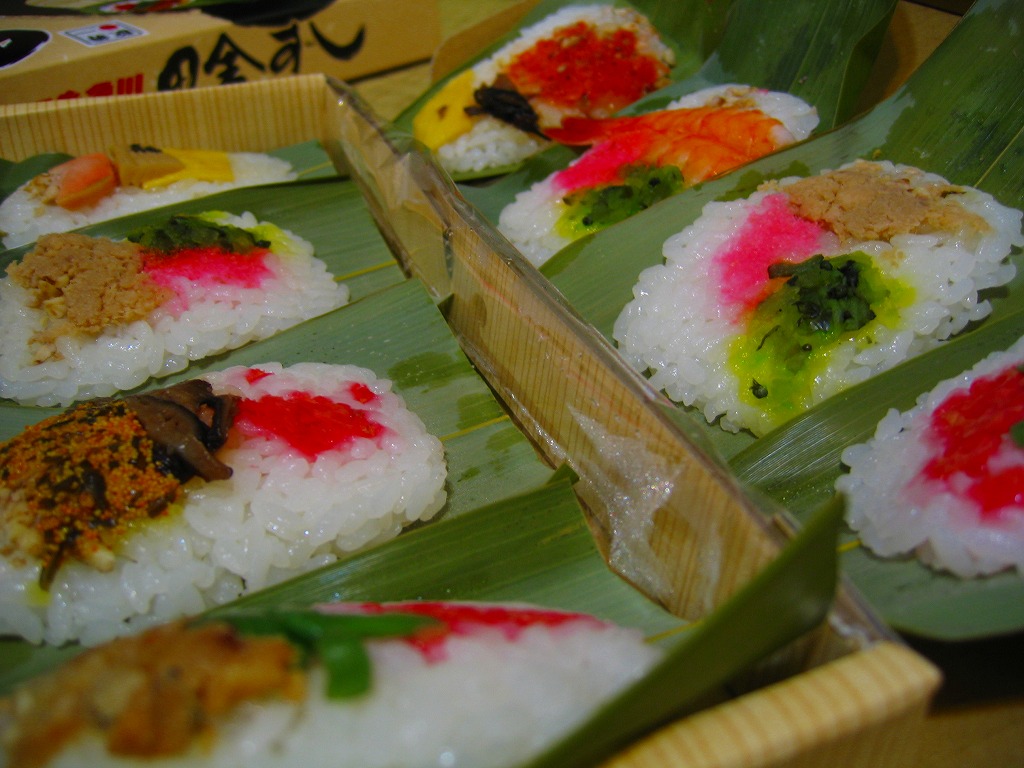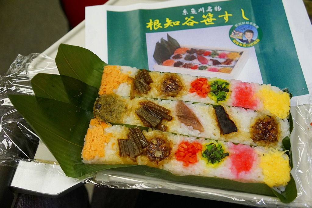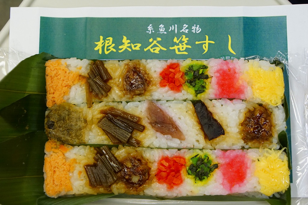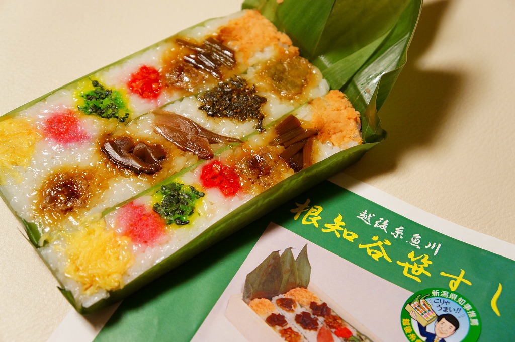 2009(平成21)年の購入時の数年前から、越後湯沢駅や糸魚川駅の売店で販売されていた、糸魚川の郷土料理。とても小さな木製の押寿司容器をラップで包む。容器の中でさらにラップで包まれた中身は、笹の葉に酢飯を詰めて、卵、桜でんぶ、青シソの実の漬物、紅生姜、くるみ、キャラブキ、鮭そぼろをこの順番で貼り付けた、やはりとても小さな棒状笹寿司が3本入るもの。商品の解説と宣伝として、手書きのコピーがついていた。