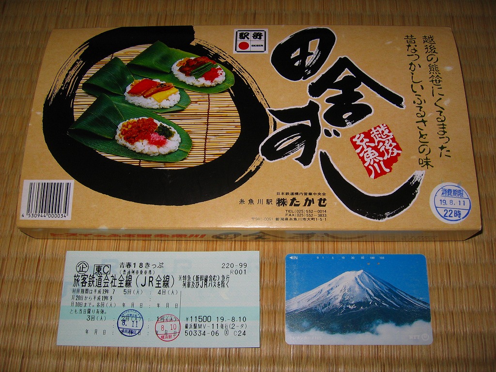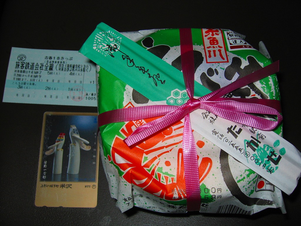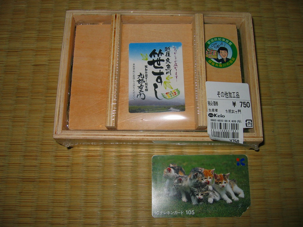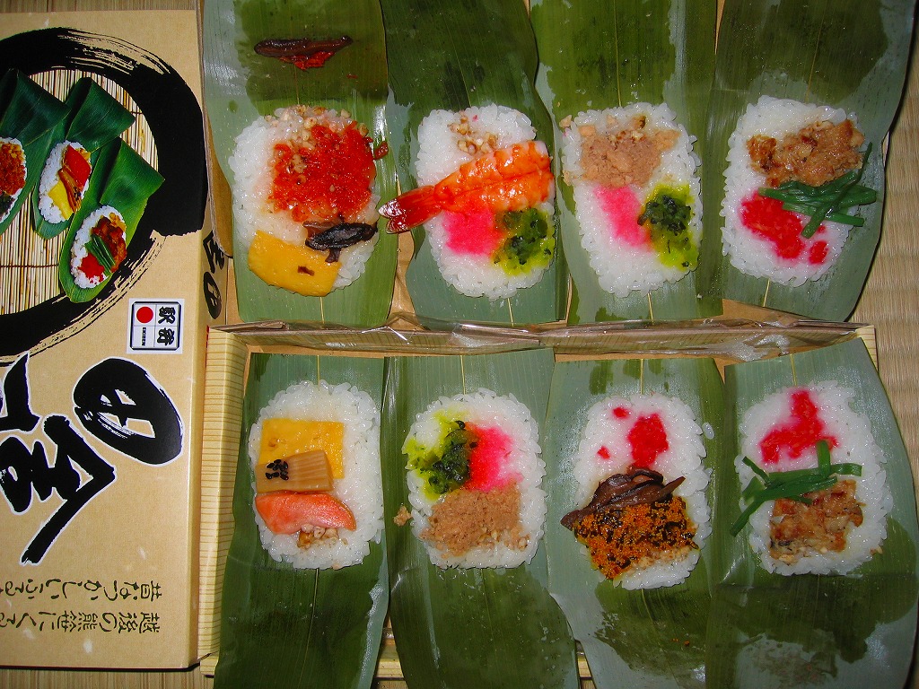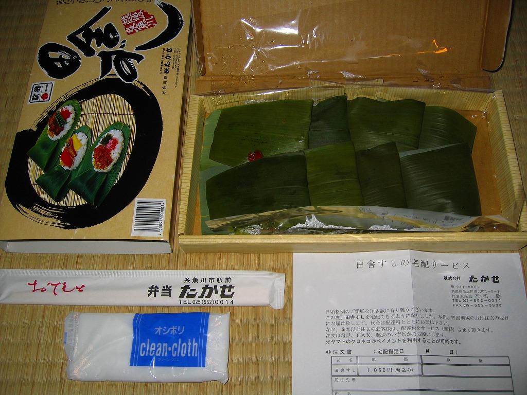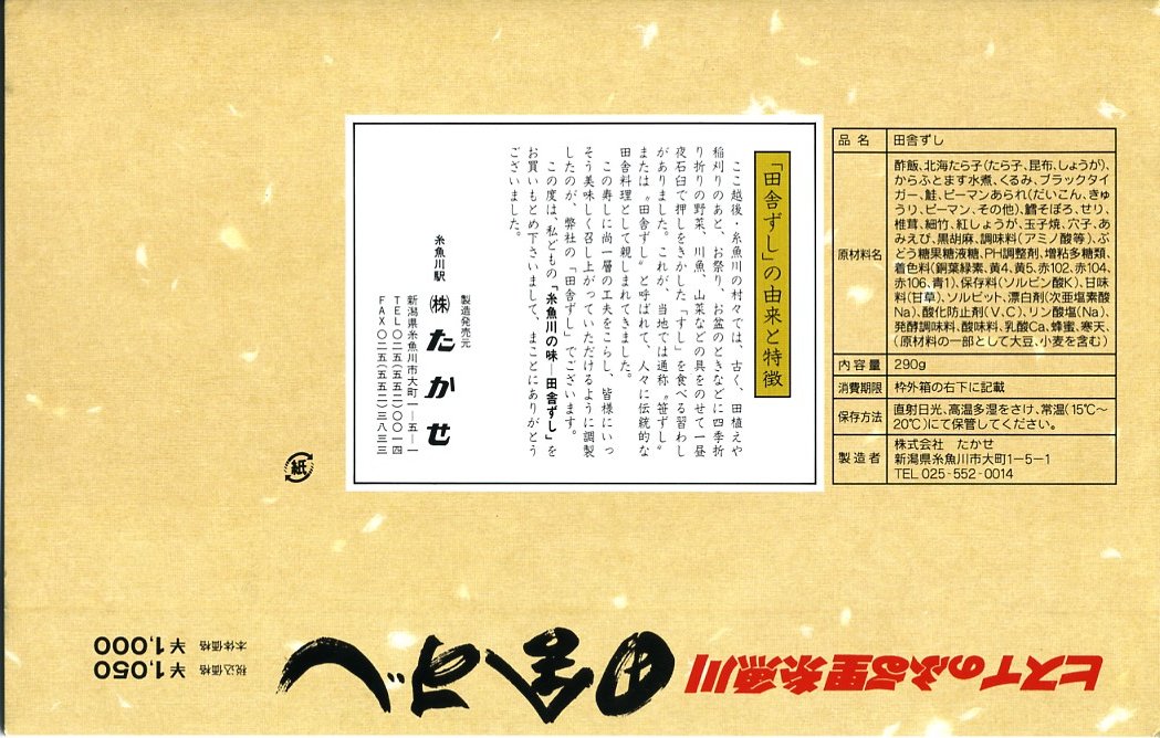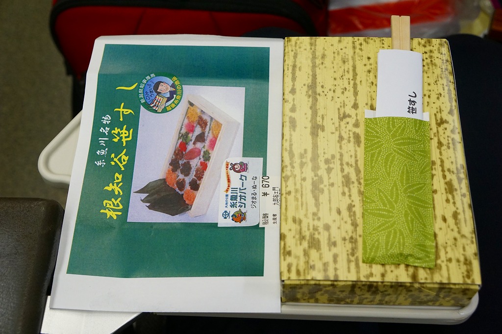 2009(平成21)年の購入時の数年前から、越後湯沢駅や糸魚川駅の売店で販売されていた、糸魚川の郷土料理。とても小さな木製の押寿司容器をラップで包む。容器の中でさらにラップで包まれた中身は、笹の葉に酢飯を詰めて、卵、桜でんぶ、青シソの実の漬物、紅生姜、くるみ、キャラブキ、鮭そぼろをこの順番で貼り付けた、やはりとても小さな棒状笹寿司が3本入るもの。商品の解説と宣伝として、手書きのコピーがついていた。
