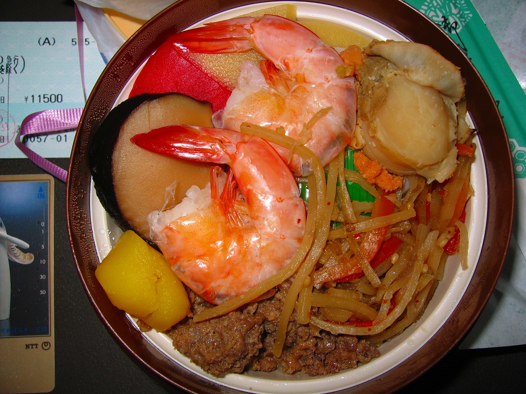 その商品の雰囲気から年季物だと思うが、過去の紹介や収穫報告が絶無な駅弁。上記の駅弁「えび釜めし」と同じく、本体もふたもプラ製の釜飯向け容器に、茶飯を詰め、ホタテ煮3個と、きんぴらごぼう、そぼろ、さつまいも、クリ、板紅生姜などで覆う。つまり「えび釜めし」のエビをそのままホタテに置き換えた感じ。味も同じに思えるが、殻付きのエビに苦戦しない分だけ食べやすく、風味も優れたと思う。あるいはこの茶飯の味付けは、ホタテに合うものか。調製元の閉店により、2013年11月限りで終売となった。