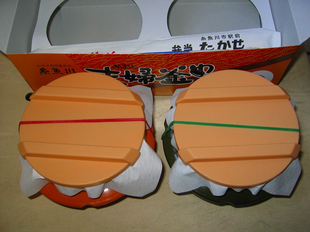 糸魚川駅で唯一の幕の内駅弁。専用のボール紙箱には、茅葺き屋根と白馬連峰を描いた。白いプラ製トレーに入った中身は、ひとつが日の丸御飯、もうひとつがおかずで焼鮭、蒲鉾、玉子焼、つくね、帆立フライ、山菜、煮物各種など。価格と内容を見比べて、少し残念な意味で古めかしい、幕の内タイプの駅弁に感じた。北陸本線の特急列車の車内販売では、このような普通の幕の内弁当が他にあまりなかったようで、そこでは親しまれたものか。調製元の閉店により、2013年11月限りで終売となった。
