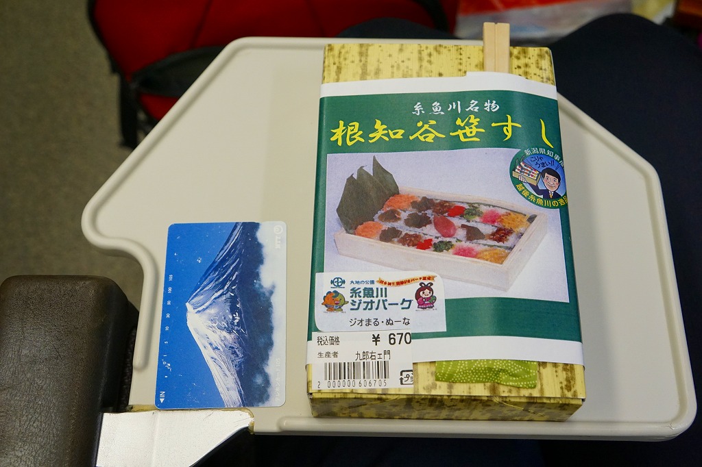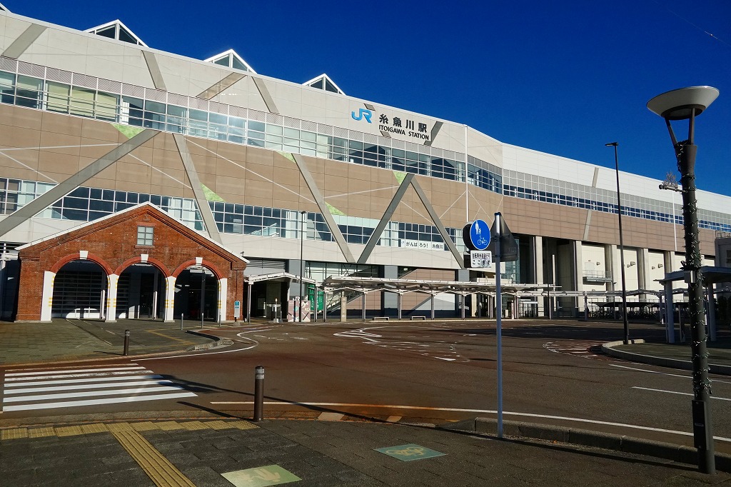 東京駅から新幹線で2時間強。糸魚川市は新潟県の西端で日本海に面する、人口約4万人の宿場町。江戸時代に北国街道と千国街道が交わり、これが鉄道や道路に替わった交通結節点であるほか、近代に水力発電や石灰や白土の産業が興り、第二次大戦後はヒスイの産地やフォッサマグナの観光でアピール。駅弁は国鉄時代からの駅弁屋が駅開業の頃から名を変えながら長らく営業したが2013年11月限りで閉店、キヨスクで売られた地元の弁当も2015年3月の新幹線の開通までに消え、2022年秋頃から土日曜の観光案内所で売り始めた「キハめし」も2025年春頃に消えた。1912(大正元)年12月16日開業、新潟県糸魚川市大町1丁目。