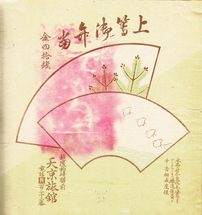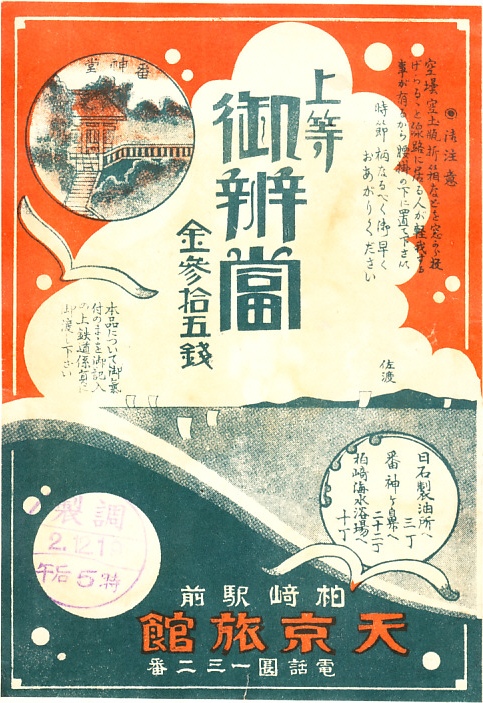 おそらく1920年代、大正10年代のものと思われる、昔の柏崎駅弁の掛紙。海に面した柏崎で、海らしい絵柄としたのだろうか。松と鳥を描く扇を重ねた。赤い部分はおそらく、過去の誰かの保管時に他の紙と重ねてインクが転移したのではないかと思う。柏崎駅では1902(明治35)年頃から1960年代過ぎまで駅弁が売られた。調製元の天京は、柏崎では名の通った旅館だったらしい。