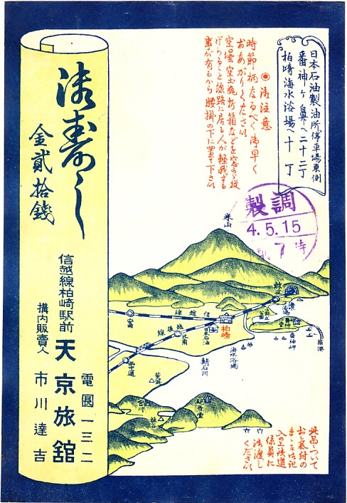 1929(昭和4)年5月15日の調製と思われる、昔の柏崎駅弁の掛紙。駅弁の名前は「港寿し」か、当時の駅弁で一般的な「御寿し」か。下記の「上等御辨當」とは逆に、佐渡島の方角から柏崎市街を眺めたような構図。米山のふもとの地名や鉄道を具体的に描く。