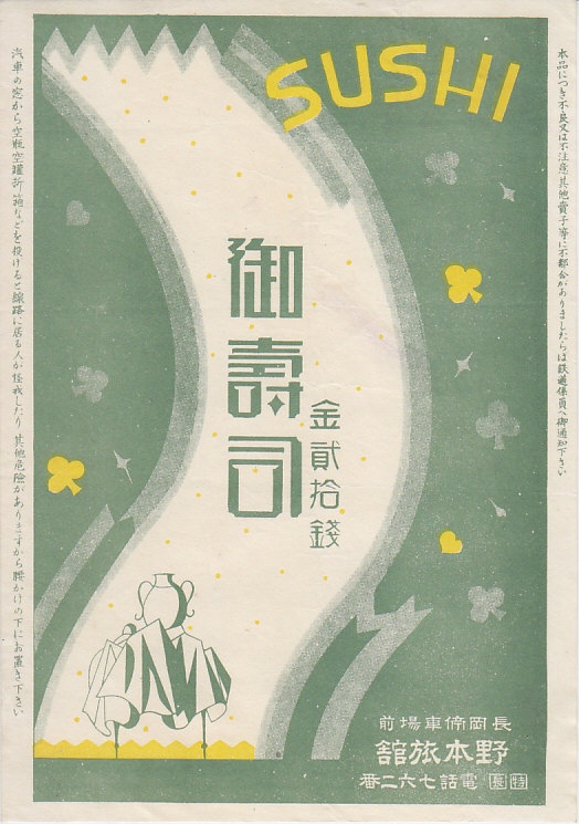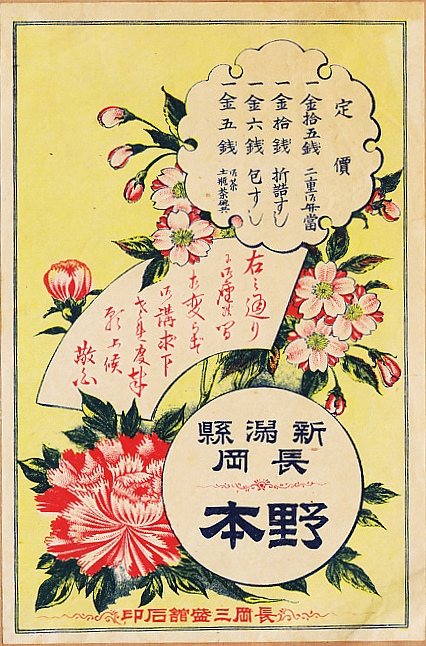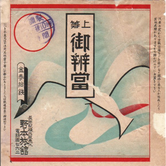 1900年代、明治30年代のものと思われる、昔の長岡駅弁の掛紙。弁当15銭、折詰すし10銭、包すし6銭の定価からそう判断した。これは駅弁の掛紙ではなく、調製元の広告チラシかもしれない。後の野本弁当部は、1904(明治37)年頃から長岡駅で駅弁などを販売したという。