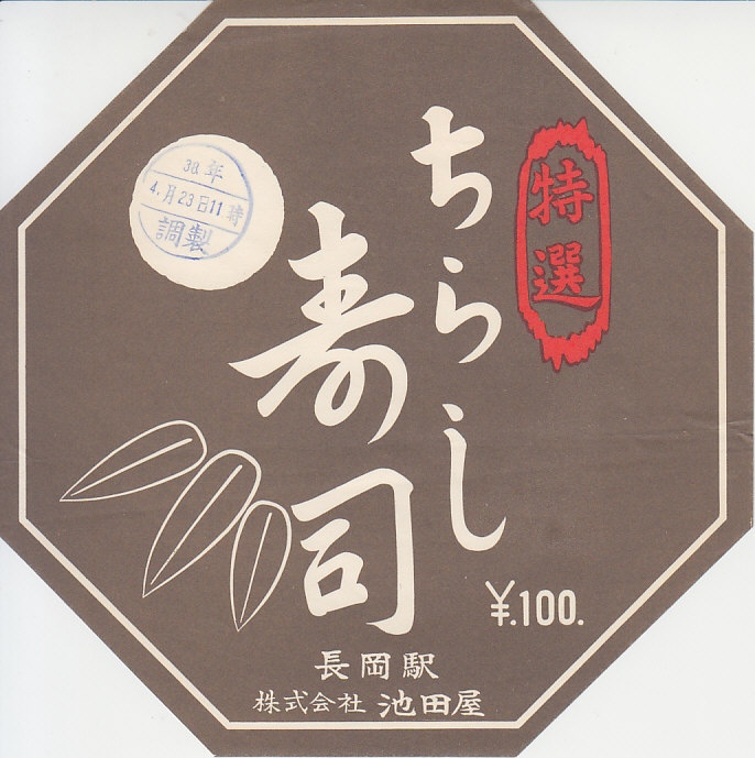 1963(昭和38)年4月24日(水)17時の調製と思われる、昔の長岡駅弁の掛紙。価格を押印で入れているが、お寿司の駅弁であれば価格が変わったり上等や並等があることは、あまりないと思う。歌舞伎の隈取なのかどうか、不気味な顔が恐ろしい。