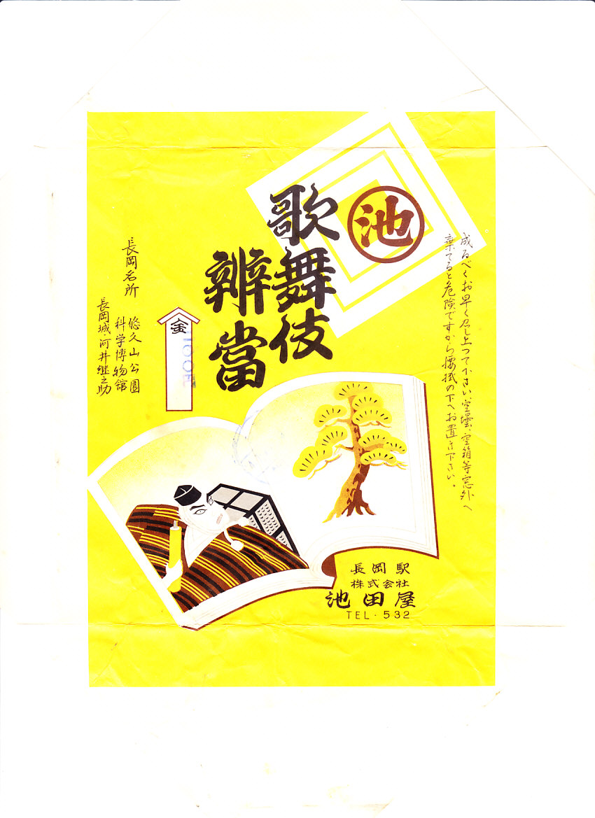 1963(昭和38)年4月23日(火)の調製と思われる、昔の長岡駅弁の掛紙。歌舞伎の名前と絵柄を持つが、価格を押印にして使いまわせる、おそらく幕の内弁当の掛紙。