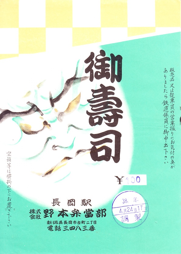 1963(昭和38)年4月26日(金)13時の調製と思われる、昔の長岡駅弁の掛紙。兜城と松林と大名行列で長岡を表現か。この名の駅弁は手持ちの資料では、1964年の長岡駅にみられるのみ。中身は立派な太巻きか何かだったのか。