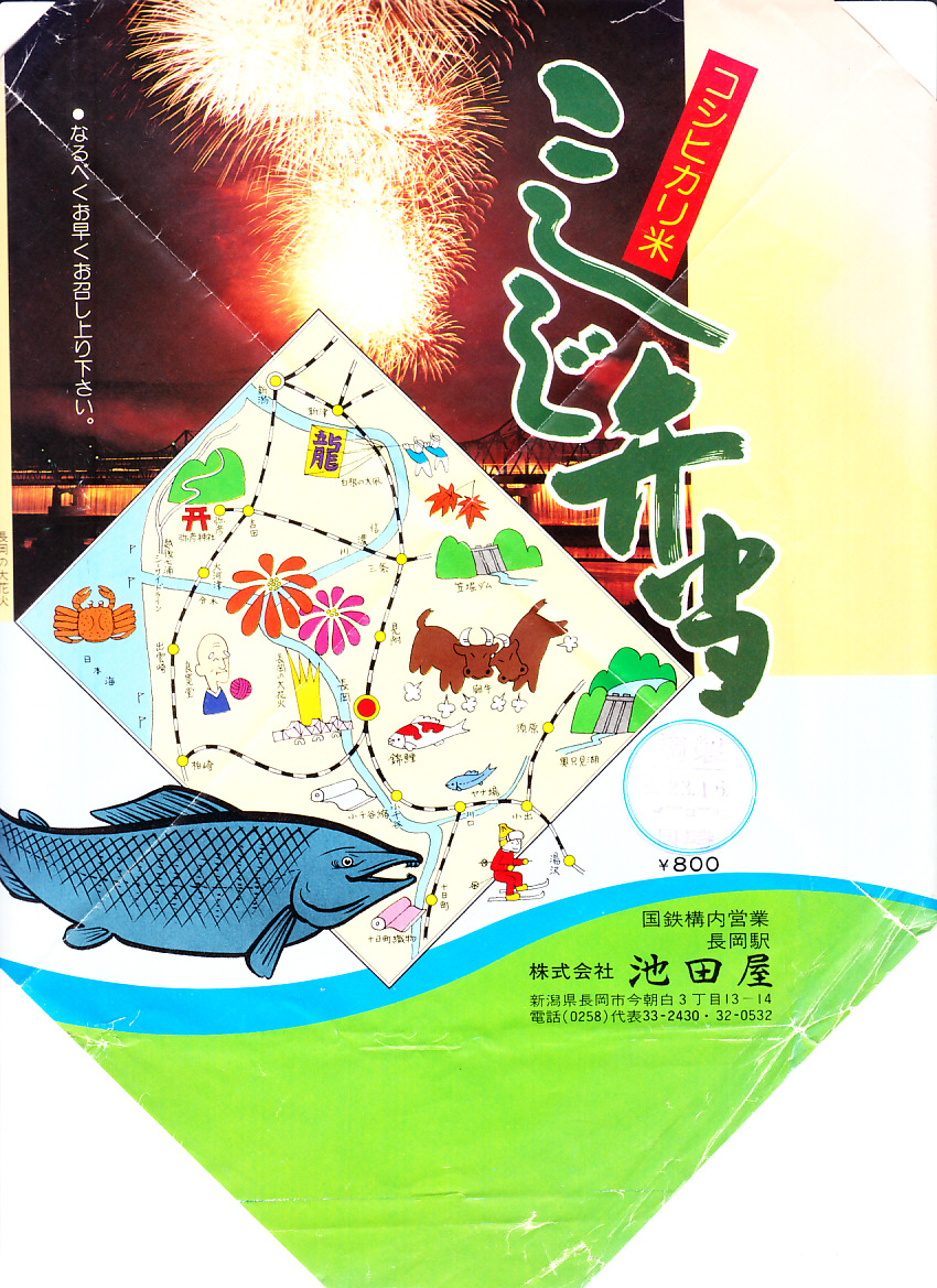 1980年代の調製と思われる、昔の長岡駅弁の掛紙。長岡花火の写真と、新潟・長岡エリアの鉄道路線図イラストマップに鮭を描く。1982年開業の上越新幹線はまだ現れていない。