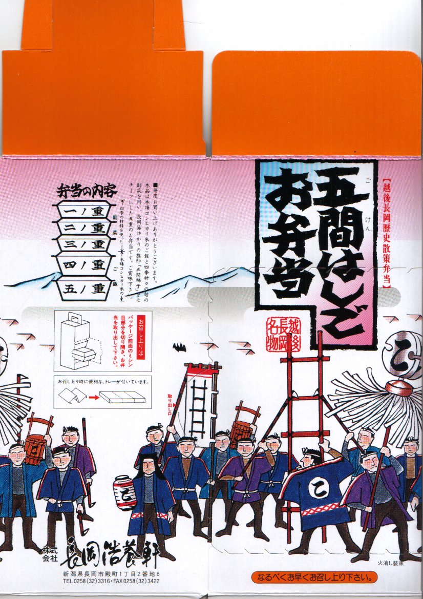 長岡藩の旗印「五間梯子(はしご)」にちなみ、パッケージにもそれが描かれる。味は良いが狭い列車内では食べ辛そうで、駅弁大会か持ち帰りまたは多人数でいただくのが適当か。食事のための弁当ではなく酒のつまみになるものがたくさん入っていると面白そうな気がした。しかしこの駅弁は、2009年6月の調製元の事業停止により失われた。