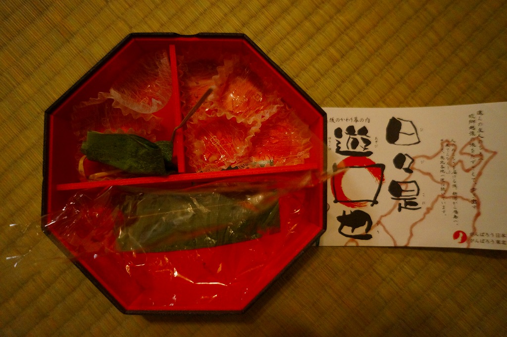 正八角形の容器に、A4判にたくさんの文字を書いた掛紙を巻く。中身はフィルムに包んだ円柱形の日の丸おにぎりと醤油飯おにぎり、神楽南蛮鶏団子3個、牛肉うま煮、玉子焼、ミョウガ味噌漬、イカにんじん、笹団子など。長岡ではなく福島がテーマのようにも掛紙で読めるが、幕の内とも書いてあるので、一風変わった普通弁当として新幹線での一食に良い感じ。