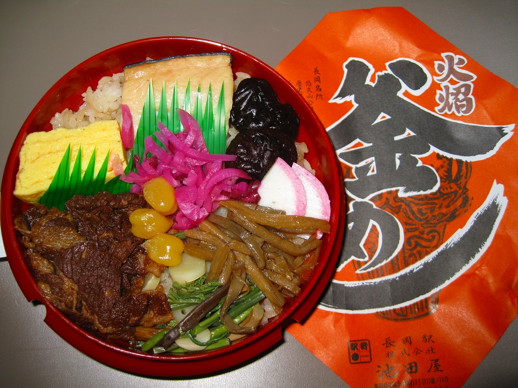 昭和60年代の発売か。浅く平たく浅いプラ製の釜型容器を使用、駅弁の名前と土器を描いた朱色の掛紙をかける。中身は茶飯の上を牛肉旨煮、焼鮭、玉子焼、山菜、きんぴらごぼう、かまぼこ、椎茸、煮豆、漬物で覆うもの。牛肉入りの釜飯が駅の顔となるのは、ここと山陰本線和田山駅くらいだろうか。筋が歯間に挟まるワイルドさは長岡駅弁の特徴だと思った。価格は2010年の購入時で800円、2015年時点で850円、2020年時点で950円、2023年時点で1,050円。調製元の公式サイトでは2023年時点で「お休み中」とのこと。