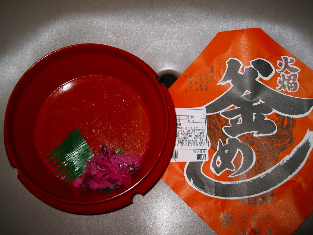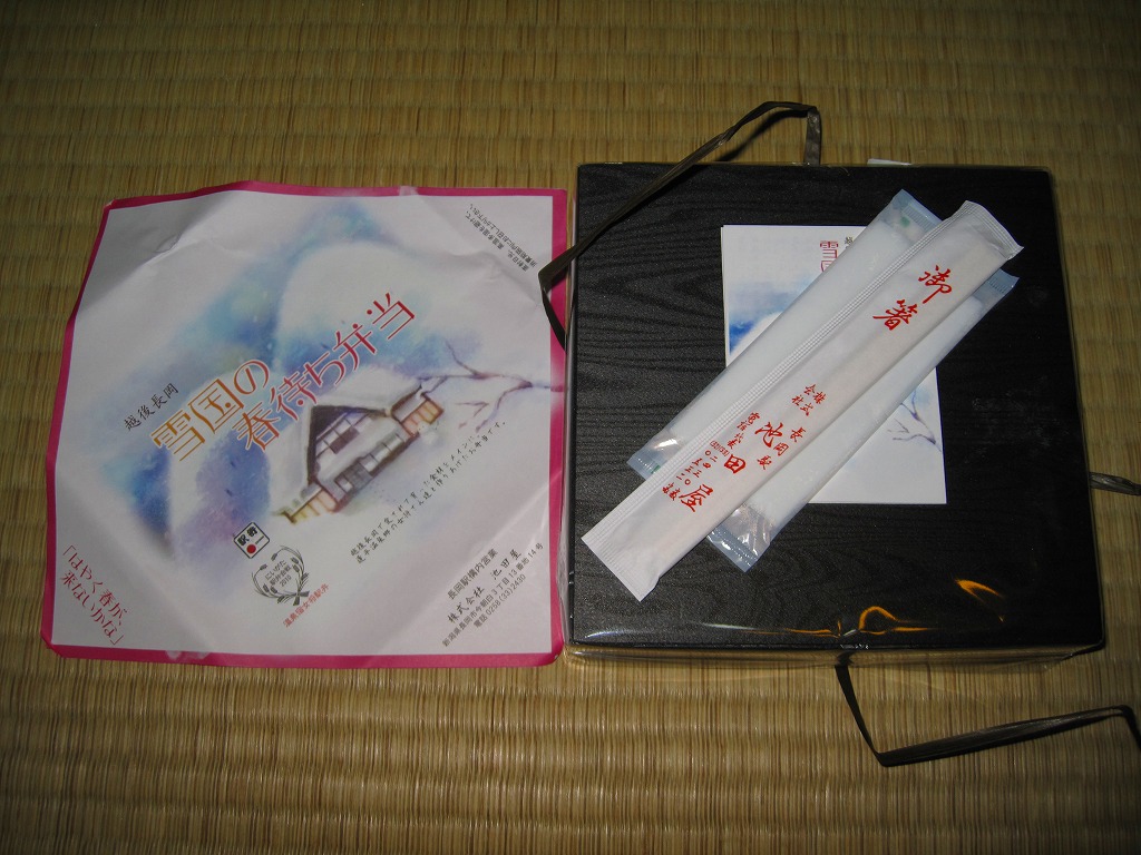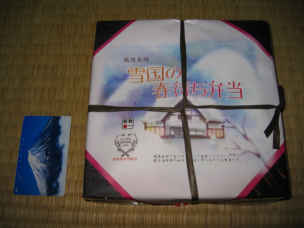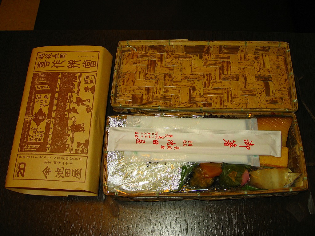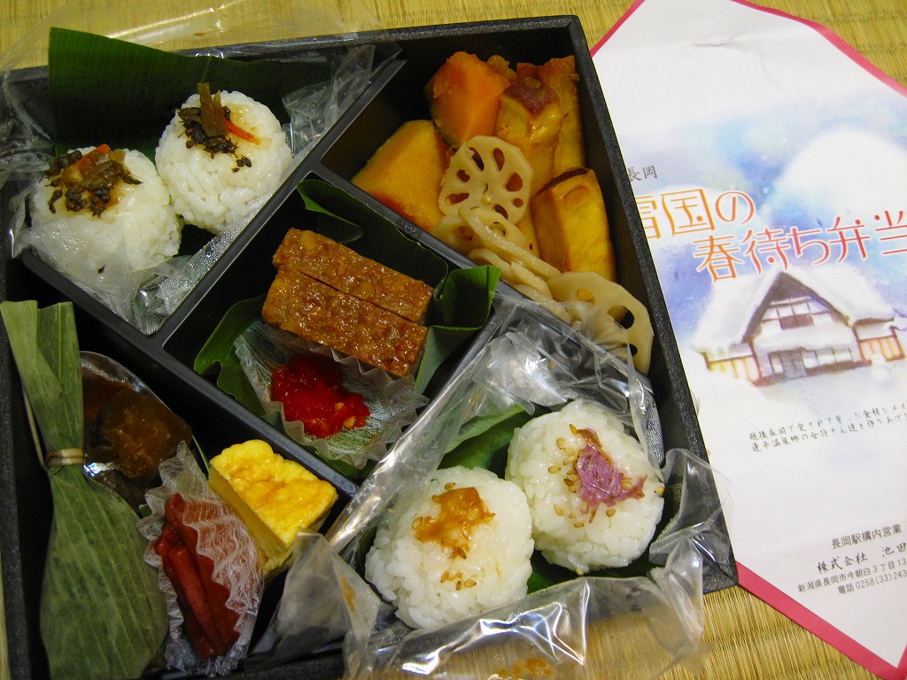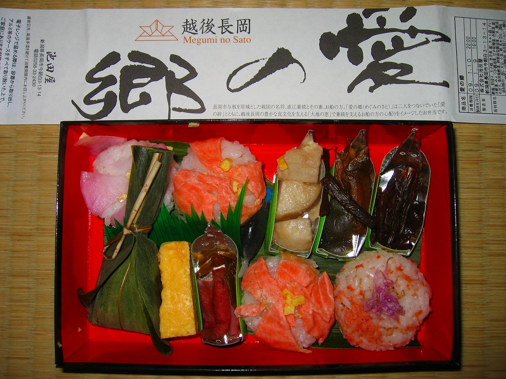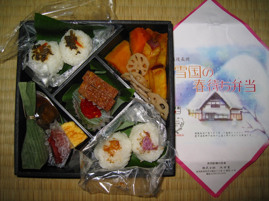 この駅弁は直江兼続をイメージした愛妻弁当だそうで、実は2009年のNHK大河ドラマ「天地人」にちなんでいる。妻の「お船の方」が長岡出身ということで、長岡野菜を多く使ったそうな。見るからに手間をかけて、とても地味に郷土の味が詰まり、そのコストがおそらく価格に反映されてしまっており、来年の今頃に残っているかどうか。あるいは調製元が「限定販売」をうたっており、今シーズン限りの駅弁かもしれない。2011年まで販売された模様。
