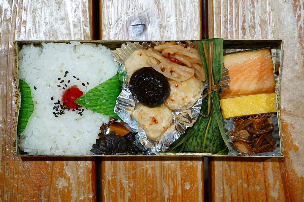 中身は梅肉とごま、菊酢漬けとごま、神楽南蛮としその実漬けで3種4個の球状御飯と、カボチャやレンコンの煮物、牛松風焼なる方形ハンバーグ、玉子焼、大学芋ことサツマイモのスティック、笹団子、漬物2種にとてもとても辛い神楽南蛮塩漬など。昭和と21世紀が混じったような風味と内容であり、本物2枚と紙製1艘と模造2枚で笹の葉たっぷりの内容でもある。