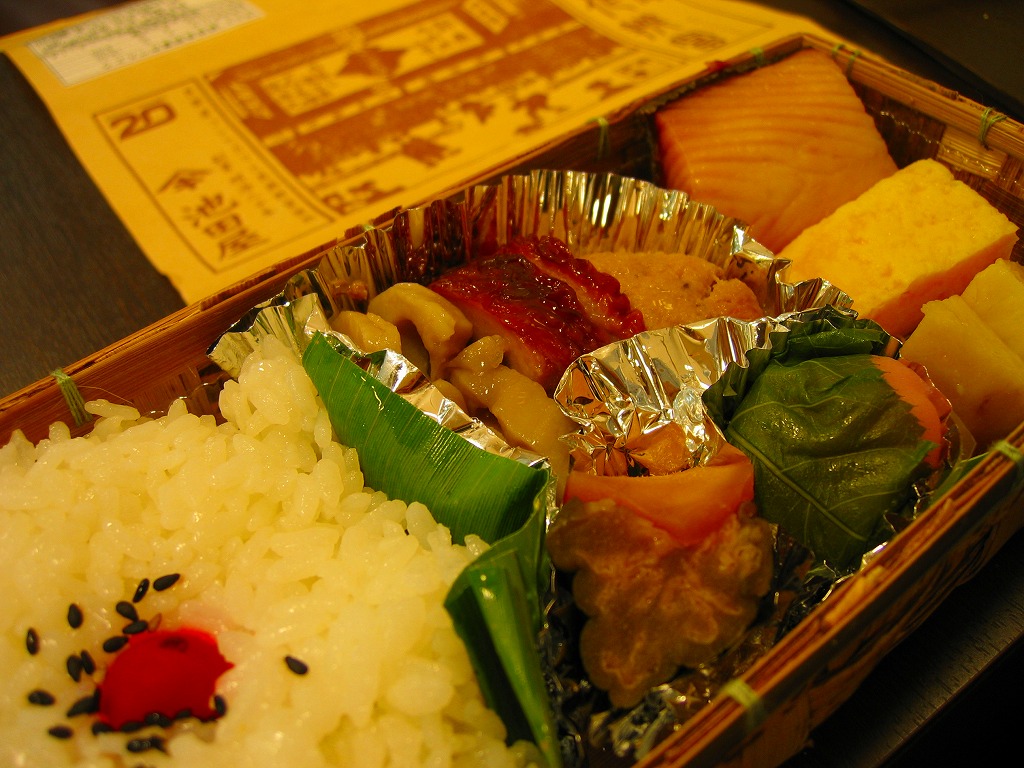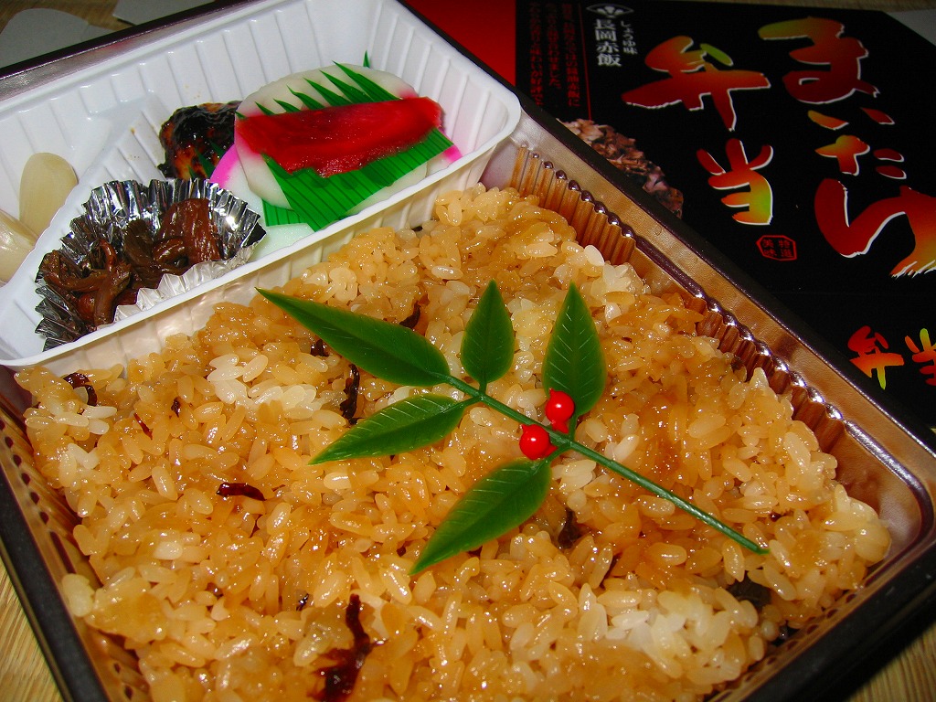 1981(昭和56)年に発売。昔懐かしい赤地銀色なプラ製容器を輪ゴムで十字にしばり、CGデザインの紙箱に詰める。中身は舞茸混じりの長岡赤飯こと醤油おこわに、焼サワラ、蒲鉾、蓮根、ぜんまい、らっきょう、生姜を添えるもの。