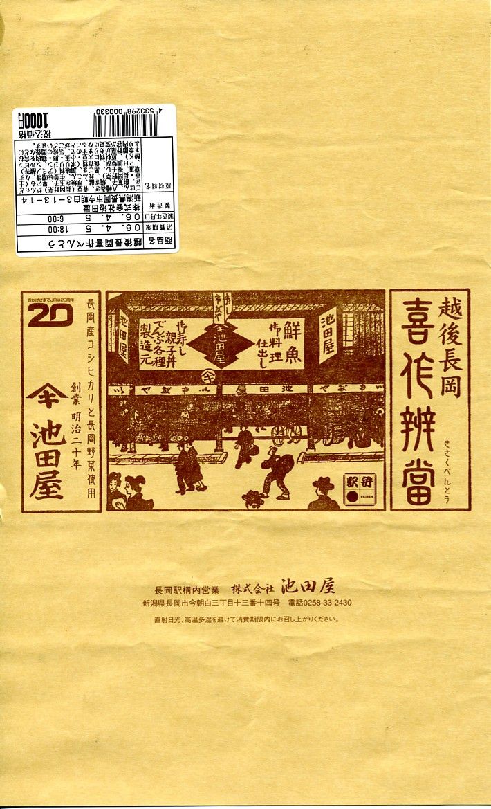 JR20周年の記念駅弁の長岡駅池田屋版として、調製元の創業120年も記念して、2007(平成19)年8月に発売。駅弁の名前は調製元を創業した永橋喜作の名にちなむ。竹皮柄の紙容器に巻かれた掛紙には、駅弁屋になる前の明治時代の調製元店舗の版画を描く。