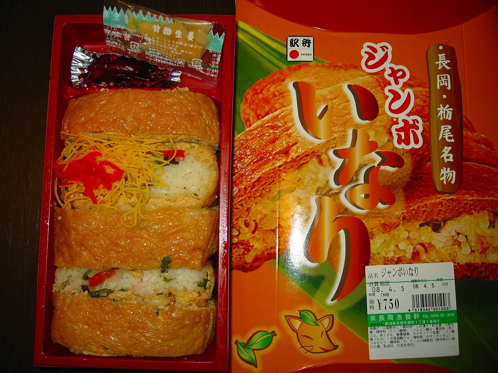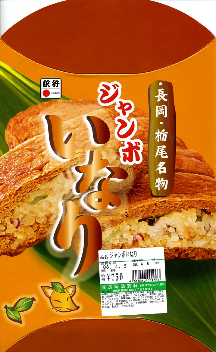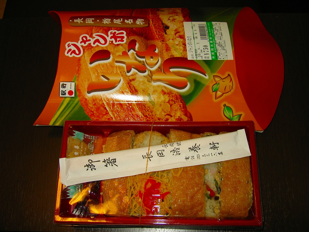 JR20周年の記念駅弁の、長岡駅弁の長岡浩養軒版として、2007(平成19)年に発売。手に持つと重量感のあるボール紙立体容器には、中身の写真が大きく掲載される。あまり大きくないトレー接着の容器に詰まる中身は、山菜入り酢飯を使った巨大なおいなりさんが1個。これを5切れにカットし、長辺方向に強引に詰め込んでいる。