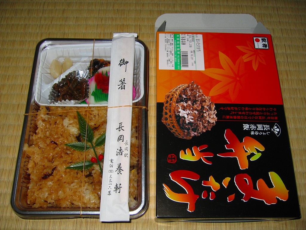 パッケージにひっそり記される長岡赤飯とは、おこわのこと。由来は定かでないが全国でも新潟県内でも長岡でだけは、おこわを赤飯と呼ぶらしい。醤油味が一般的だが、市内のスーパーなどでは栗やキノコなど、他地域のおこわのバリエーションがある。長岡市民は他地域の赤飯の赤さを不気味に感じるとか。この駅弁は、2009年6月の調製元の事業停止により失われた。