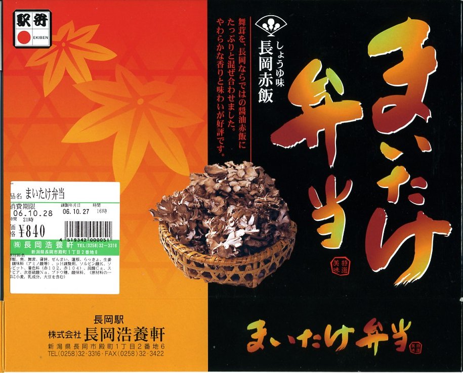 飯はうまいが、見た目はとても貧相。固結した舞茸おこわに混ざる舞茸はごく少量で、白いトレーに載る付け合わせの据わりも素っ気なく、おまけにプラ製なナナカマドの模造葉まで置かれる。こういう国鉄時代の駅弁がよくぞ21世紀に残り、しかも百貨店の駅弁催事に来てくれたもの。客寄せにはならないだろうが、越後から東京近郊のニュータウンへ移住してきた方々に、旅情と郷愁を提供する。この駅弁は、2009年6月の調製元の事業停止により失われた。