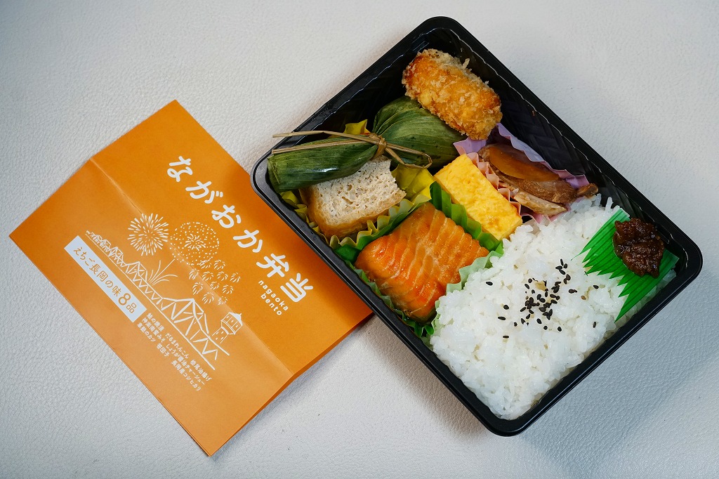 2022(令和4)年の10月14日の鉄道150年に向けて、長岡呉服町で元和4年(1618年)に創業したという仕出し料理店と、JR長岡駅のコンビニ「ニューデイズ」が協力し、改札外と新幹線改札内の同店舗で発売か。駅弁でも惣菜でも見たことがない、編み物のような型を持つ真っ黒なプラ容器に置いたしおりは、表面に商品名や長岡花火の風景などを記し、裏面にイラスト付きのおしながきを載せて、駅弁の掛紙のようなつくりをしていた。