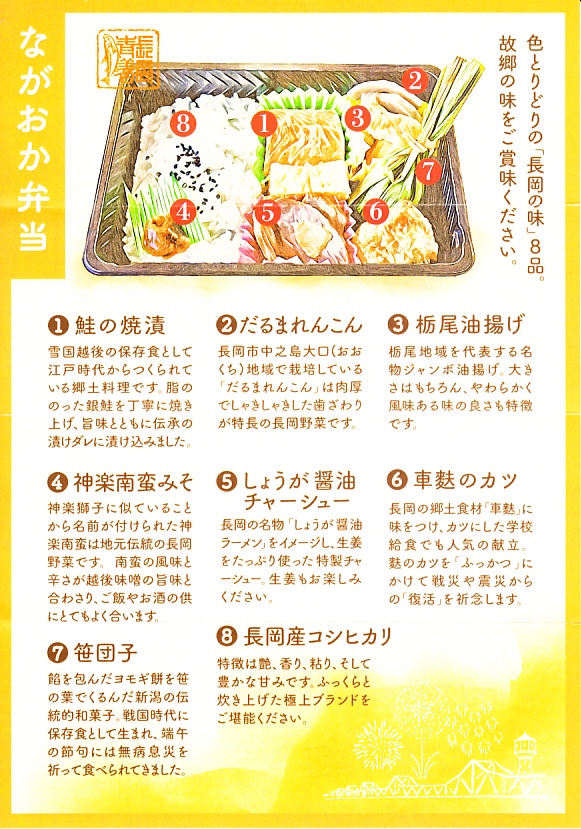 中身はその記載のとおり、鮭の焼漬、だるまれんこん、栃尾油揚げ、神楽南蛮みそ、しょうが醤油チャーシュー、車麩のカツ、笹団子、長岡産コシヒカリ。かつて長岡駅の駅弁にあった料理を含む、長岡の味8品。これが長岡駅の駅弁だという記事はまだ見ていないが、売り場と品揃えと営業時間で従前からの長岡駅弁の購入が困難になった現状、駅のコンビニで買えるうえ、調製元も内容も地元の長岡であるこのお弁当は、今の長岡駅弁といえるだろう。旧長岡市内とその周辺では、仕出し弁当としての注文もできる。