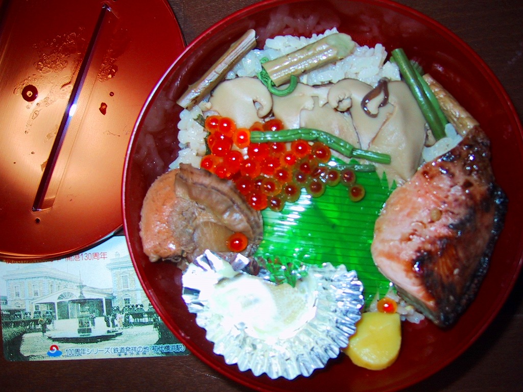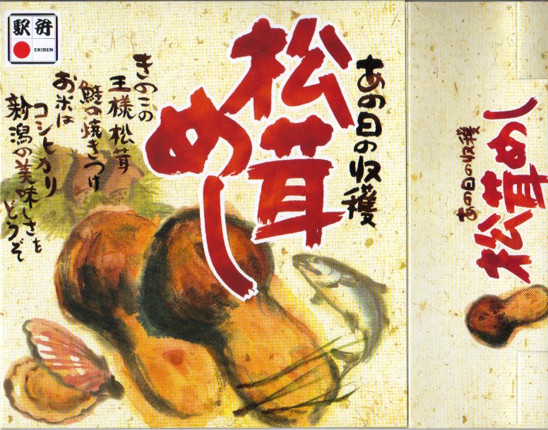 ずいぶんとしなる円形のプラスティック容器をボール紙のパッケージにはめる。中身は御飯の上に平面をなさないほど薄い松茸が数切れなど載るごく普通の松茸駅弁ではあるが、ホタテにイクラにゼンマイなどの山菜、そしてやっぱり美味な鮭の焼き付けにお米は当然コシヒカリ。松茸と意識しなければなかなか優れた駅弁だ。しかしこの駅弁は、2009年6月の調製元の事業停止により失われた。
