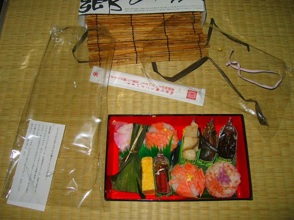 2009(平成21)年1月の発売は、京王百貨店駅弁大会への出品に向けたものか。漆器を模した長方形のボール紙製容器を使用、まきすのようなものを半分巻いて、ひもで十字にしばり、駅弁の名前や宣伝文を書いた掛紙を巻く。中身は鮭そぼろと食用菊1個、鮭2個、赤かぶ漬1個のてまりずしと玉子焼、笹製風のボートに乗った里芋煮、きゃらぶき、ミョウガたまり漬とナス味噌漬、ずいき甘酢漬、かぐらなんばん醤油漬に、笹団子がひとつ。