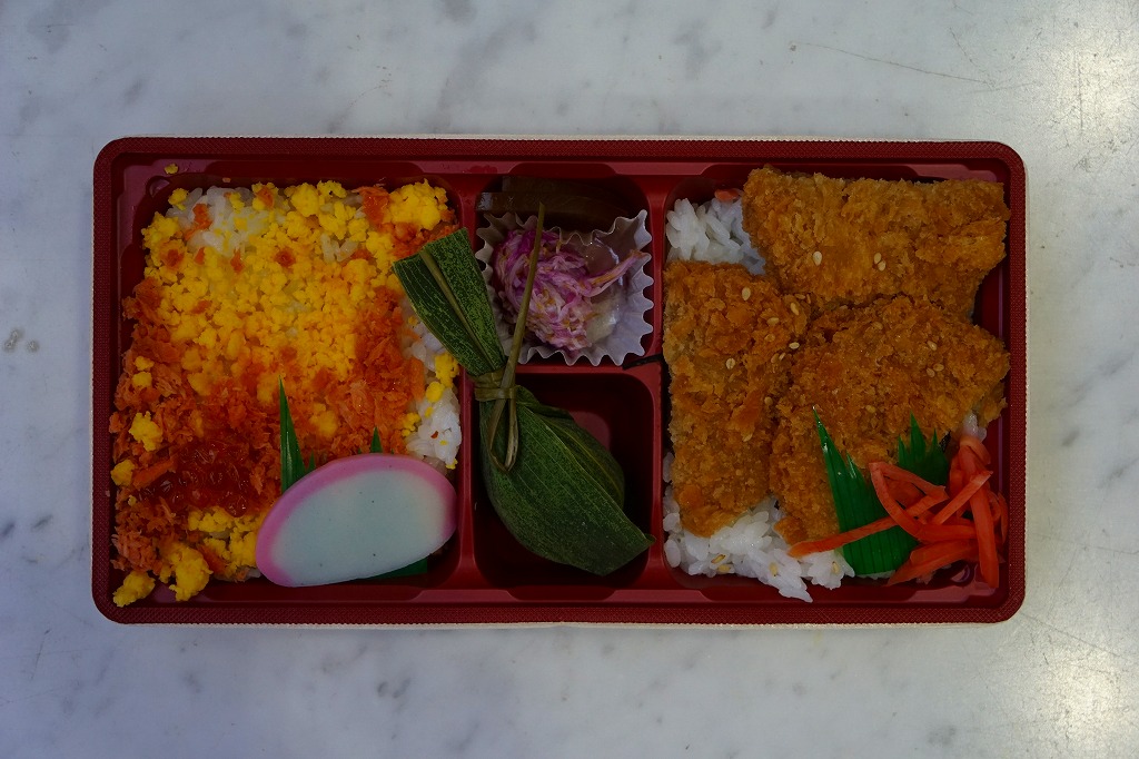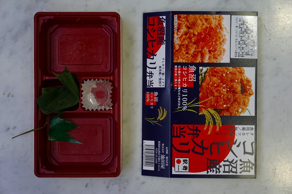 2017(平成29)年11月の発売。「越後長岡海鮮花火」ともども、調製元の創業130周年にちなむ新作らしい。横長の容器の左側で、白飯を玉子そぼろと鮭フレークで覆い、イクラとカマボコを添え、右側で白飯をタレカツで覆い、紅生姜を添え、真ん中に菊花と笹団子を置く。中身はパッケージの見本写真ほど美しくなくも、魚沼産コシヒカリという御飯はクールに香った。調製元の公式サイトでは2023年時点で「お休み中」とのこと。