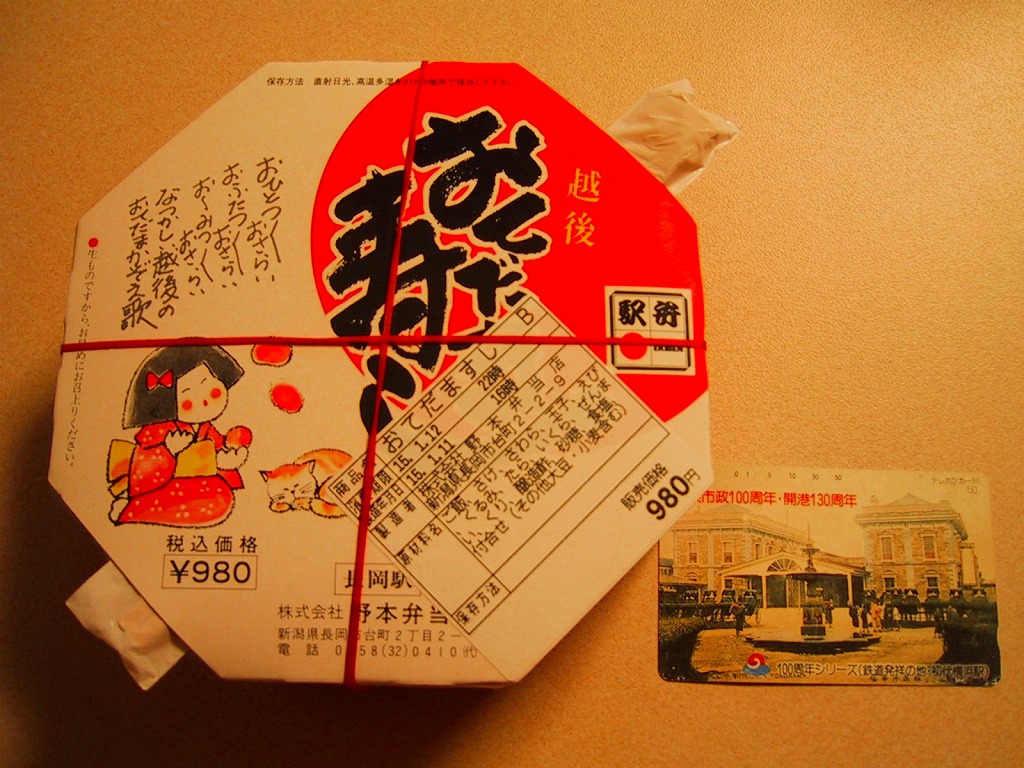 上記の駅弁「越後長岡喜作辨當」の、2008(平成20)年時点の姿であり、その前年の発売時の姿。上記の2021年のものと比べて、掛紙にJR20周年のロゴマークがあり、容器は竹皮編みで、中身の鶏肉が肉団子でなく照焼やごぼう巻で、笹団子でなく桜餅が入り、価格がちょうど千円だった。雰囲気が変わるものではない。