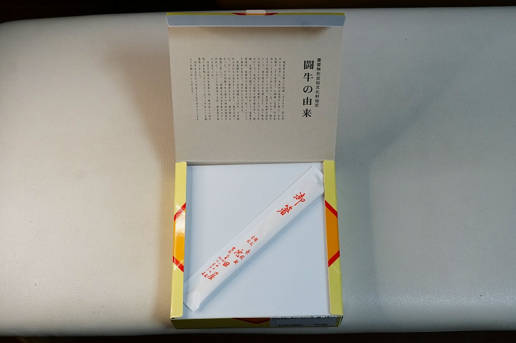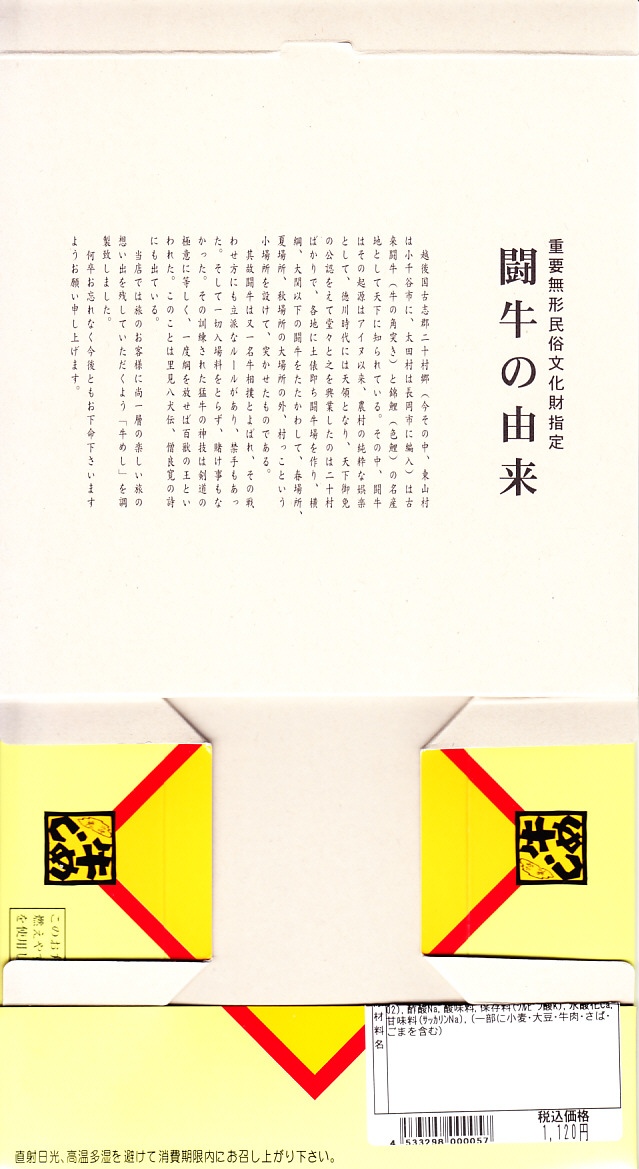 裏ぶたには重要無形民俗文化財指定の闘牛に関する記述がある。その中に新潟県古志郡山古志村に関する記述はないが、2004年10月23日の新潟県中越地震で全村避難という村単位での最大の被害を受けてか、「ガンバロウ!山古志村闘牛の里」のシールが貼られる。なお、山古志村は2005年4月に長岡市へ編入される。