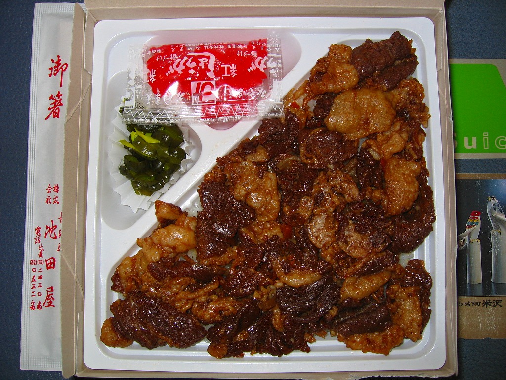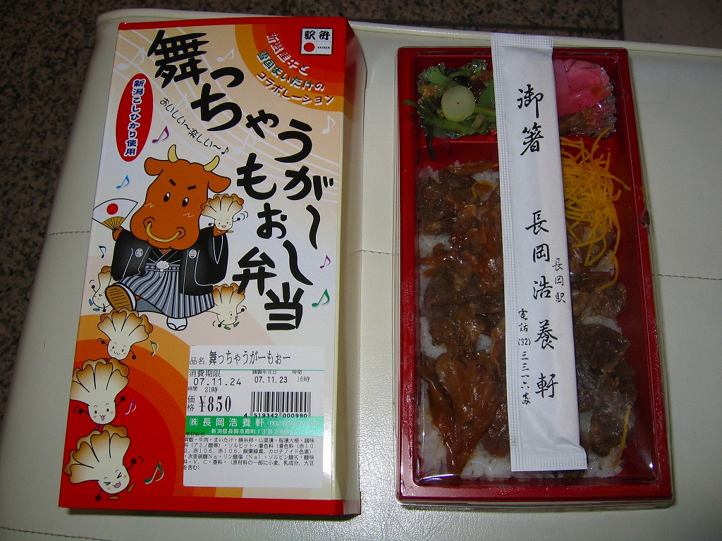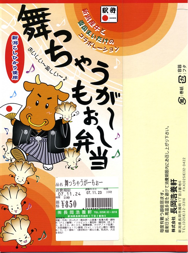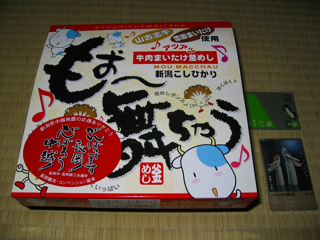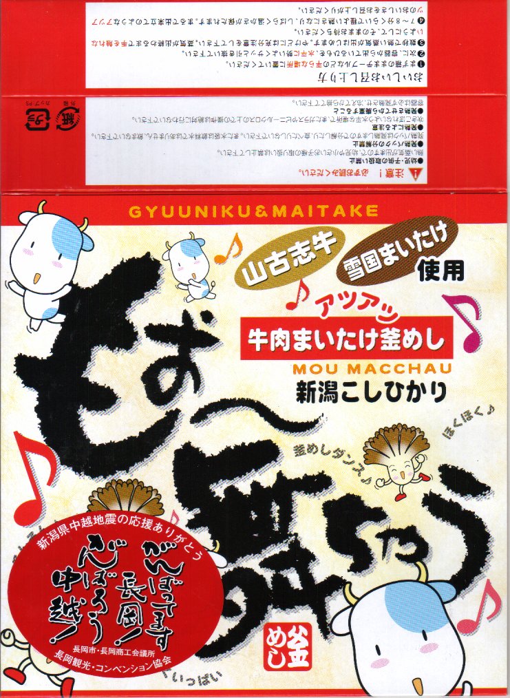 秋冬の駅弁大会シーズンに向けた、2004(平成16)年10月の新商品。円形の加熱機能付き容器を、文字やイラストがとても賑やかなパッケージに詰める。中身は新潟米コシヒカリの御飯の上に、六日町の雪国まいたけと、しょうゆと砂糖で煮込んだ山古志牛を載せるもの。メインの牛肉は硬いというか野趣あふれるというか、少なくとも暖かい状態でいただきたいもの。