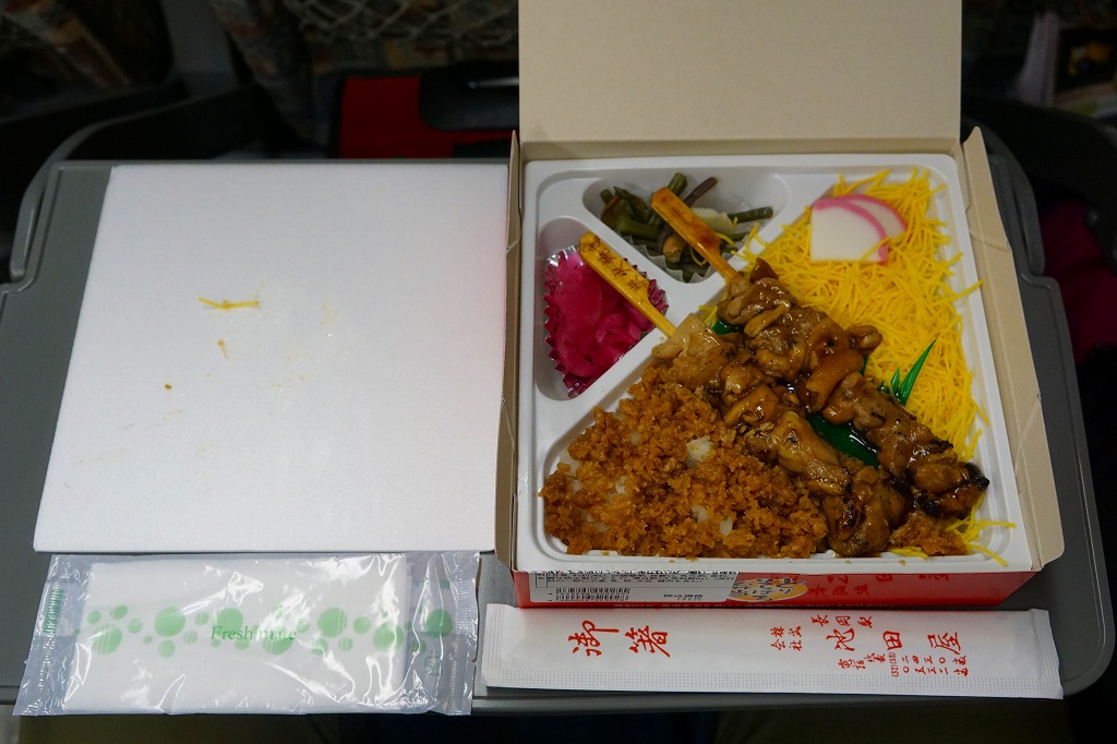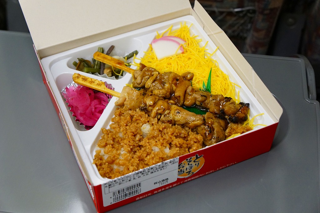 2004(平成16)年8月頃に発売か。白いトレーに保温材か緩衝材か発泡スチロールの白いふたをかけて、やや小柄な正方形のパッケージの中に詰めて食品表示ラベルで封をする。中身は白御飯の上錦糸卵と粒子が細かい鳥そぼろを載せて、その間に炭火焼き鳥を2本置いて、かまぼこで彩る。業務用冷凍食品丸出しな中身だと感じるが、焼き鳥をそのまま串で入れる駅弁は希少だと思うので、「焼き鳥&そぼろ弁当」と呼べば、もう少しは振り返られるかもしれない。価格は2010年時点で750円、2014年時点で790円、2020年時点で890円、2022年時点で販売休止中。