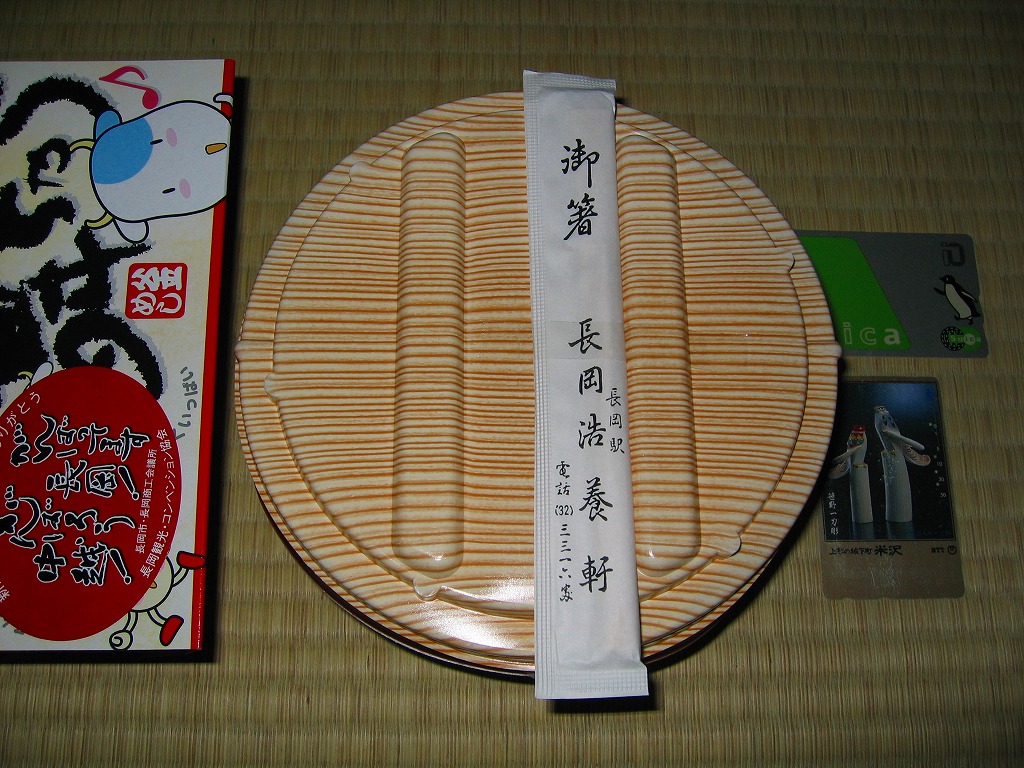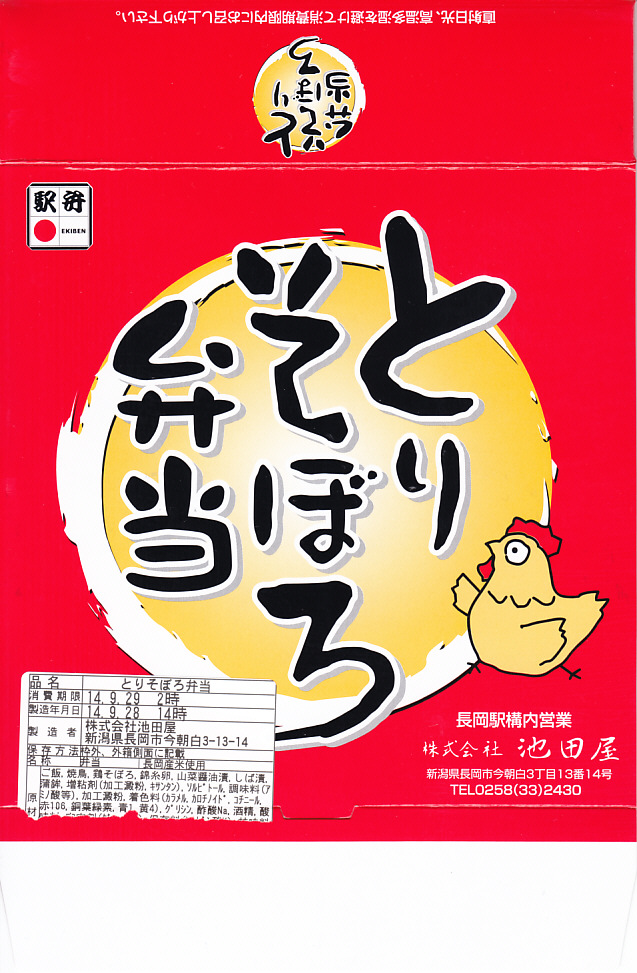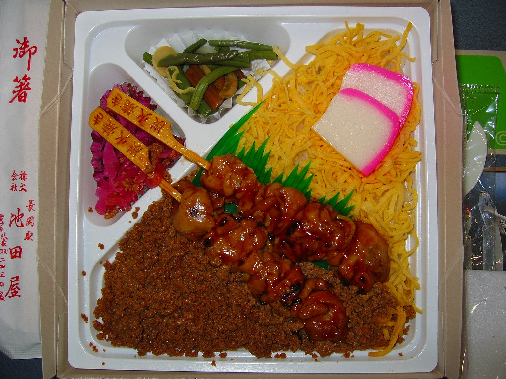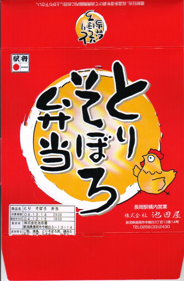 2004(平成16)年12月14日に購入した、長岡駅弁のパッケージ。上記の10年後と、容器も中身もまったく同じ。2か月前に起きた大地震を受けた、復興支援目的の百貨店催事で購入した。輸送の影響か災害の影響か、新潟県の駅弁にしては御飯がうまくなかった。