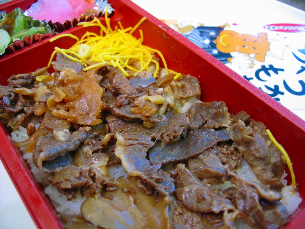 2007(平成19)年の夏頃に発売か。つまり下で紹介する「もぉ〜舞ちゃう」の非加熱機能付き容器版で、長方形のトレー接着容器に同じ中身が入っている。今回は甘すぎるが冷たくても柔らかくうまみがある牛細切の風味が個性的。この駅弁は、2009年6月の調製元の事業停止により失われた。