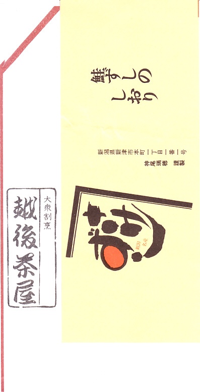 1981(昭和56)年1月27日の調製と思われる、昔の新津駅弁の掛紙。調製印から栃木県宇都宮市の西武百貨店宇都宮店で売られたことがわかる。上記の現行のものと同じく、文字と枠だけのシンプルな絵柄。当時は法定の食品表示がなく、文字が掛紙の真ん中に置かれた。
