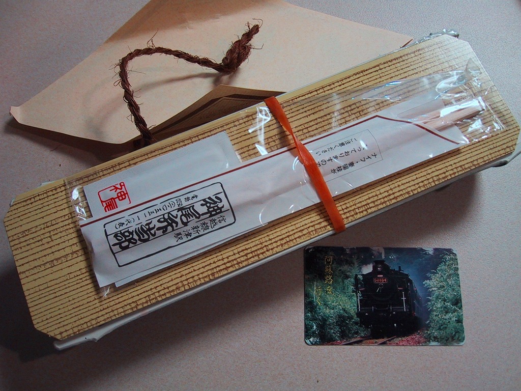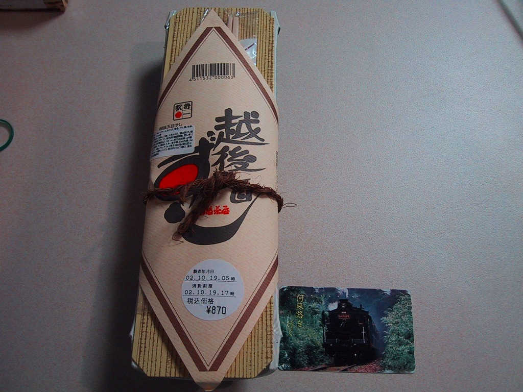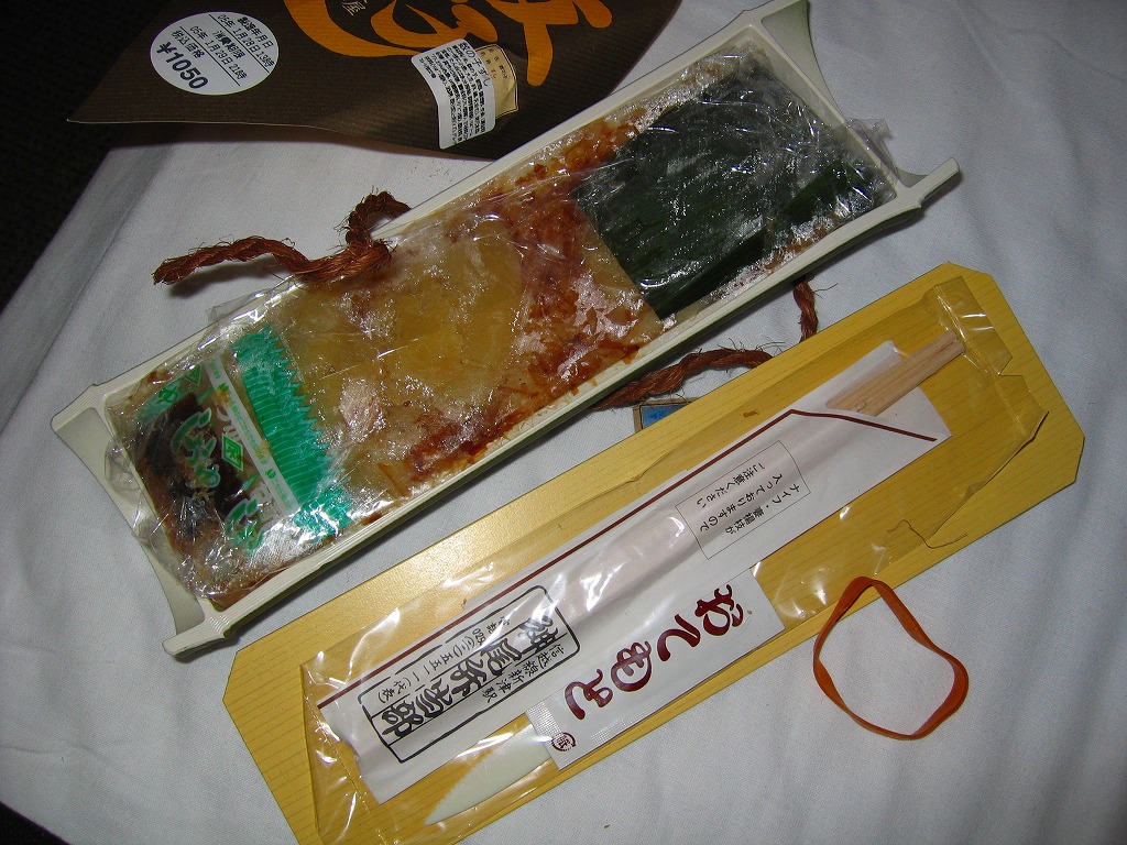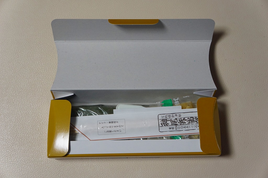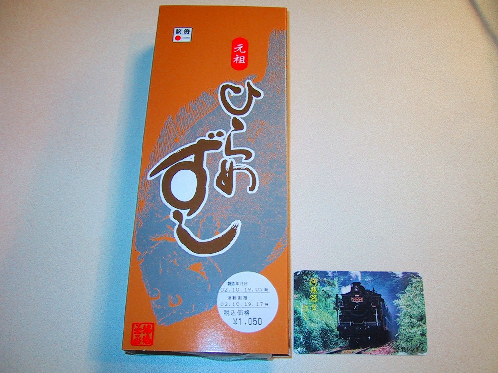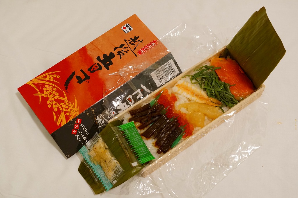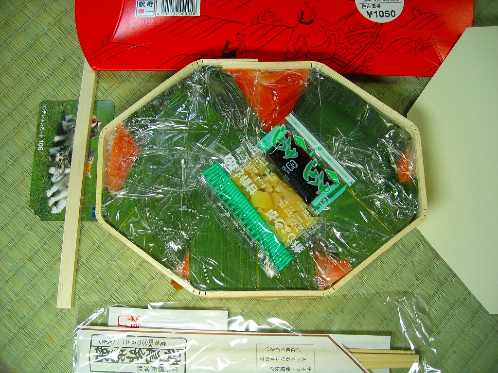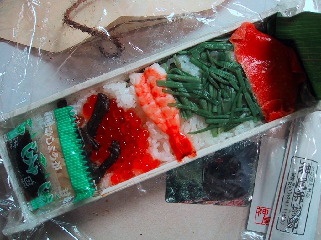 割竹を模したプラスティック製容器を使う。ラップを敷いた上に酢飯を敷いて、その上にサーモン・山みつば・海老・イクラ・フキを載せたちらしずし。割り箸とともにプラスティックのナイフが付属するが、必要はなさそう。県内で余った孟宗竹の有効利用を森林組合から要請されて誕生した駅弁だそうで、過去には本物の竹が容器として使われていたとか。御飯と鮭が美味かった。価格は2002年の購入時で870円、2015年時点で930円、2022年9月から1,000円。