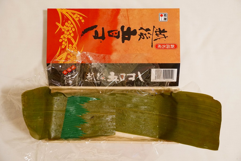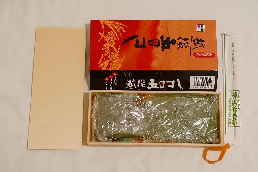 上記の駅弁「越後五目ずし」の上等版か。笹を敷いた酢飯に並べて覆う具が、順に紅鮭、山せり、えび、カズノコ、イクラ、きゃらぶきであり、カズノコが追加されている。容器が割竹型でなく長方形で、これを掛紙でなくスリーブに収める、見た目はまったくの別物で、味はそっくり。価格は2021年の購入時で1,080円、2022年9月から1,180円。