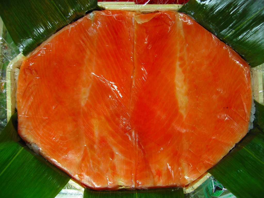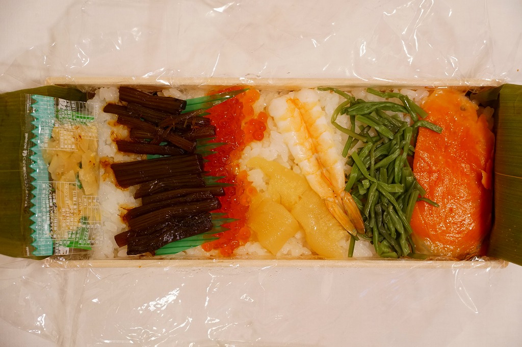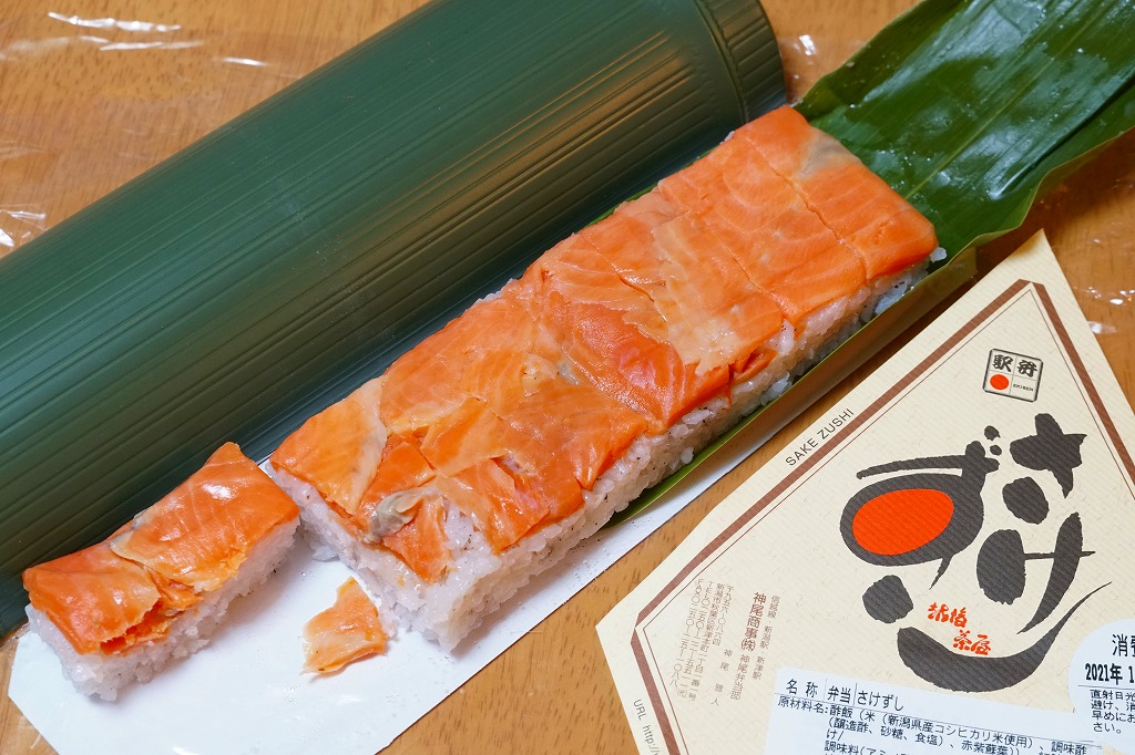 この形では他に見ない鮭押寿司駅弁。八角形の押寿司容器を紅鮭色のボール紙製パッケージに詰める。笹の葉とラップに包まれた中身は、シソを混ぜたコシヒカリの酢飯の上に紅鮭を載せて押した押寿司。同じタイプで著名な富山のますのすしと比べて、鮭と飯の風味のやわらかさが物足りなく、なるほどこれで他地域に広がっていないだろうか。