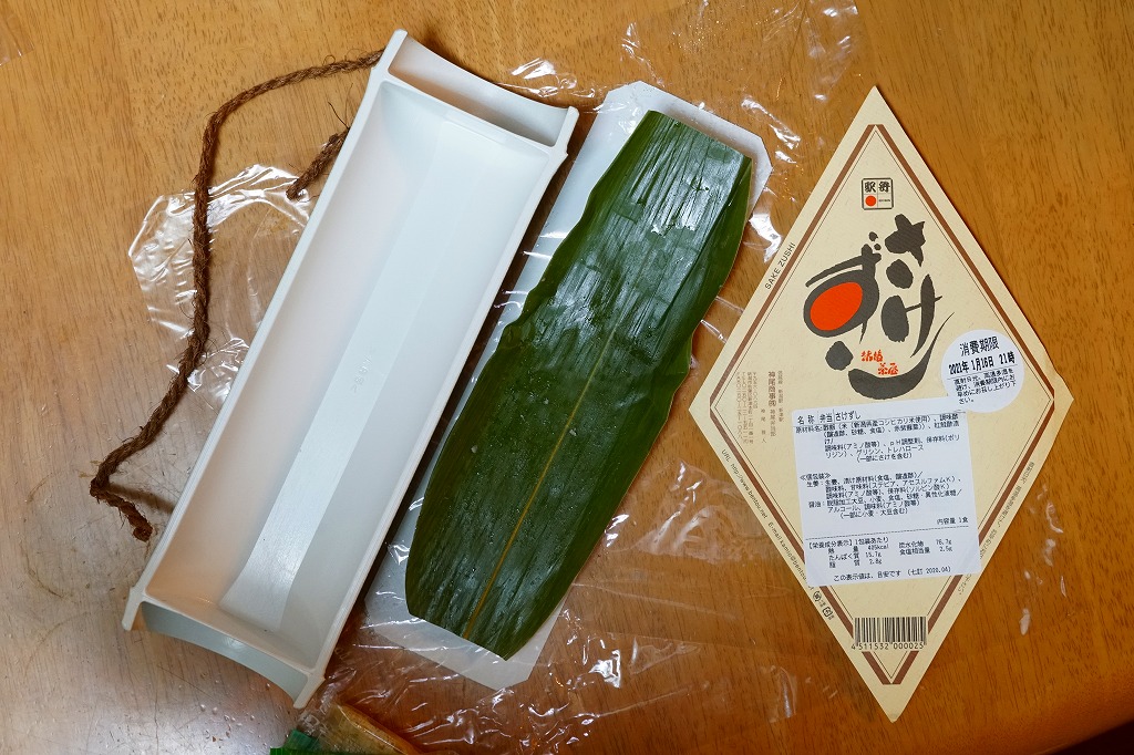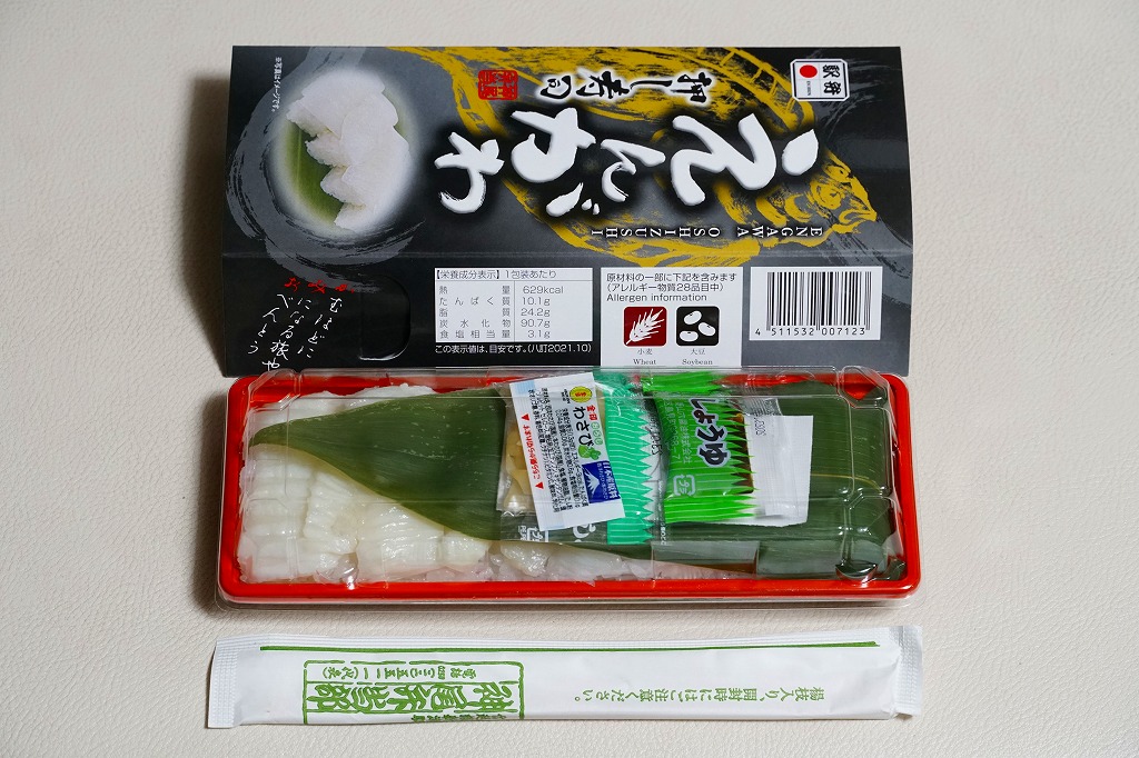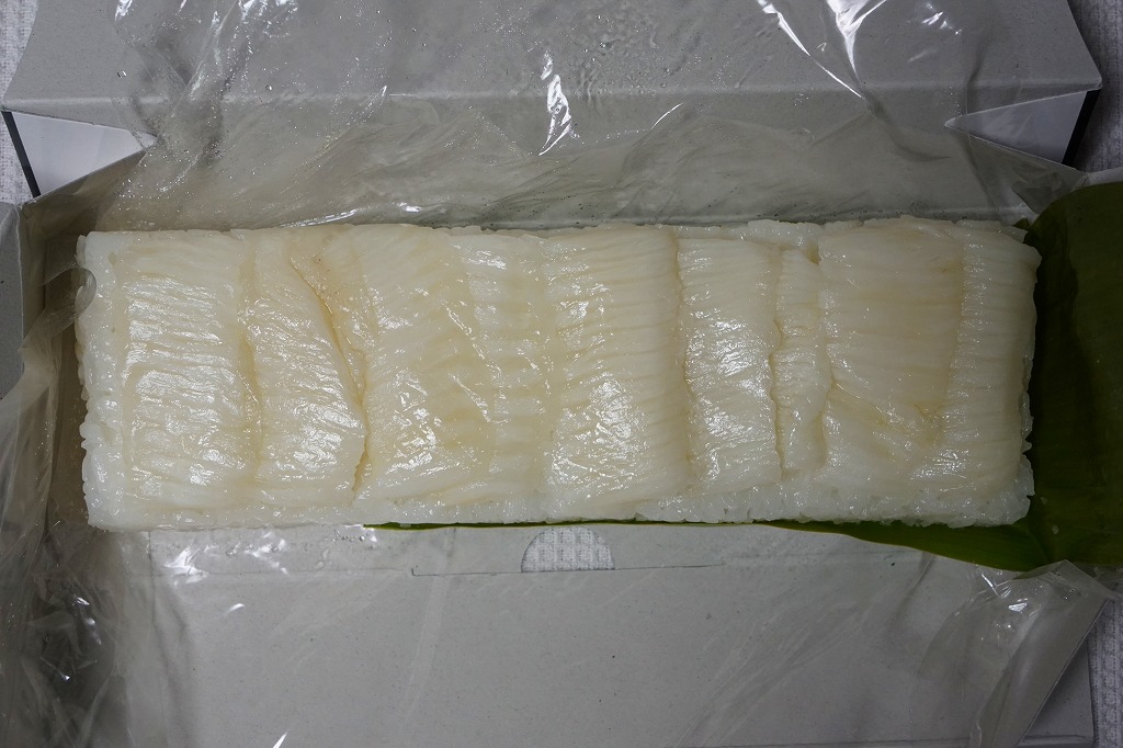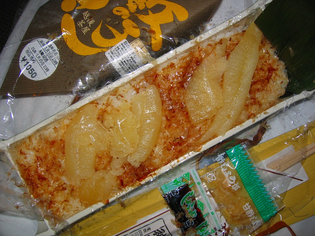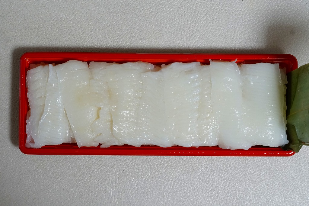 昔は本物の竹を使ったという、竹を縦に割った形状のプラスティック製容器を使用、そこに笹の葉を敷き、コシヒカリ使用のすし飯の上にたっぷりとカズノコ醤油漬が載る。その間に挟まる鰹節の効果か、カズノコも酢飯も本当にふんわりした感じが出ている。紅生姜と醤油が袋で付くが、かける前に一口はそのままでいただきたい。
